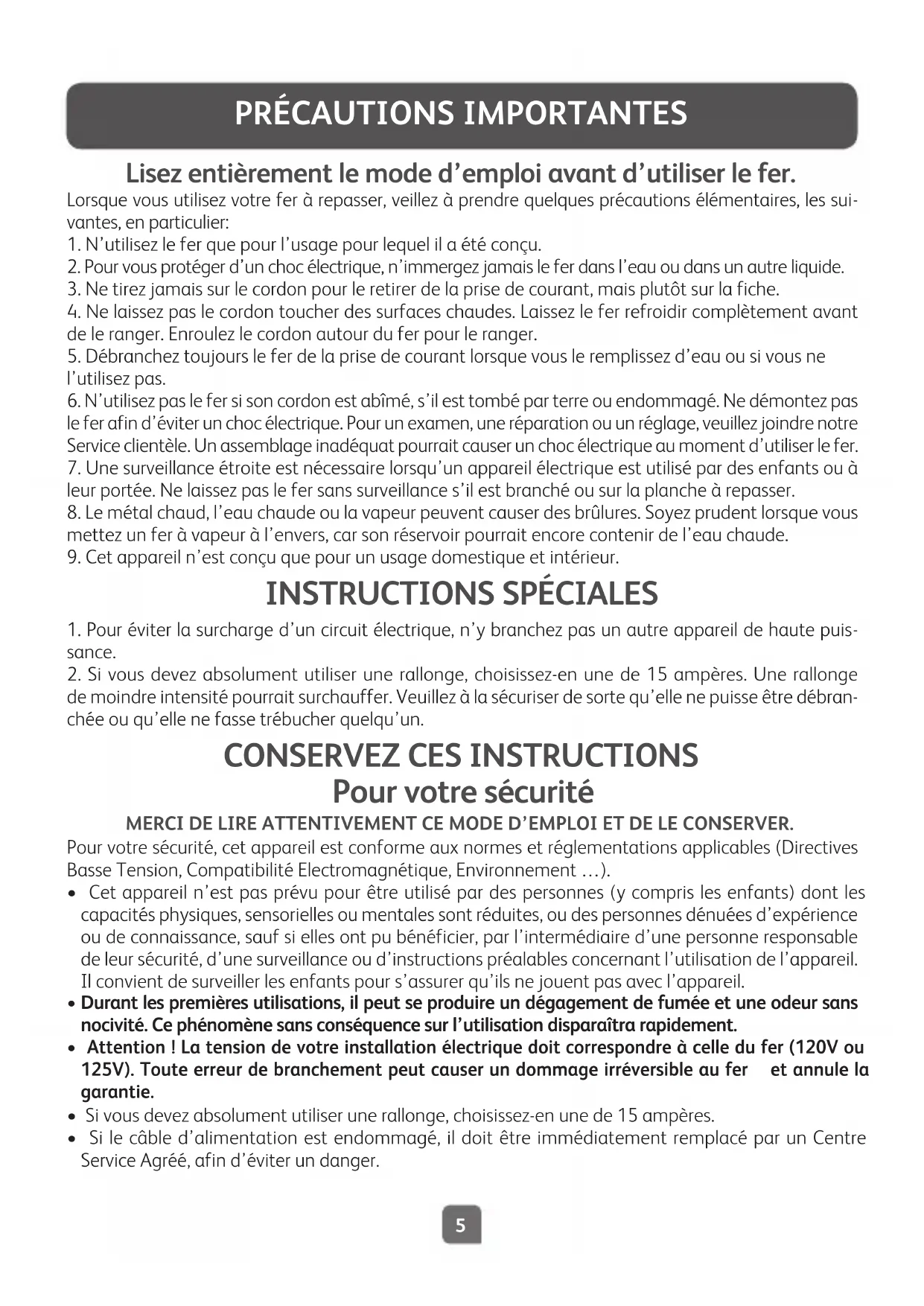 Lisez entièrement le mode d’emploi avant d’utiliser le fer. Lorsque vous utilisez votre fer à repasser, veillez à prendre quelques précautions élémentaires, les sui- vantes, en particulier: