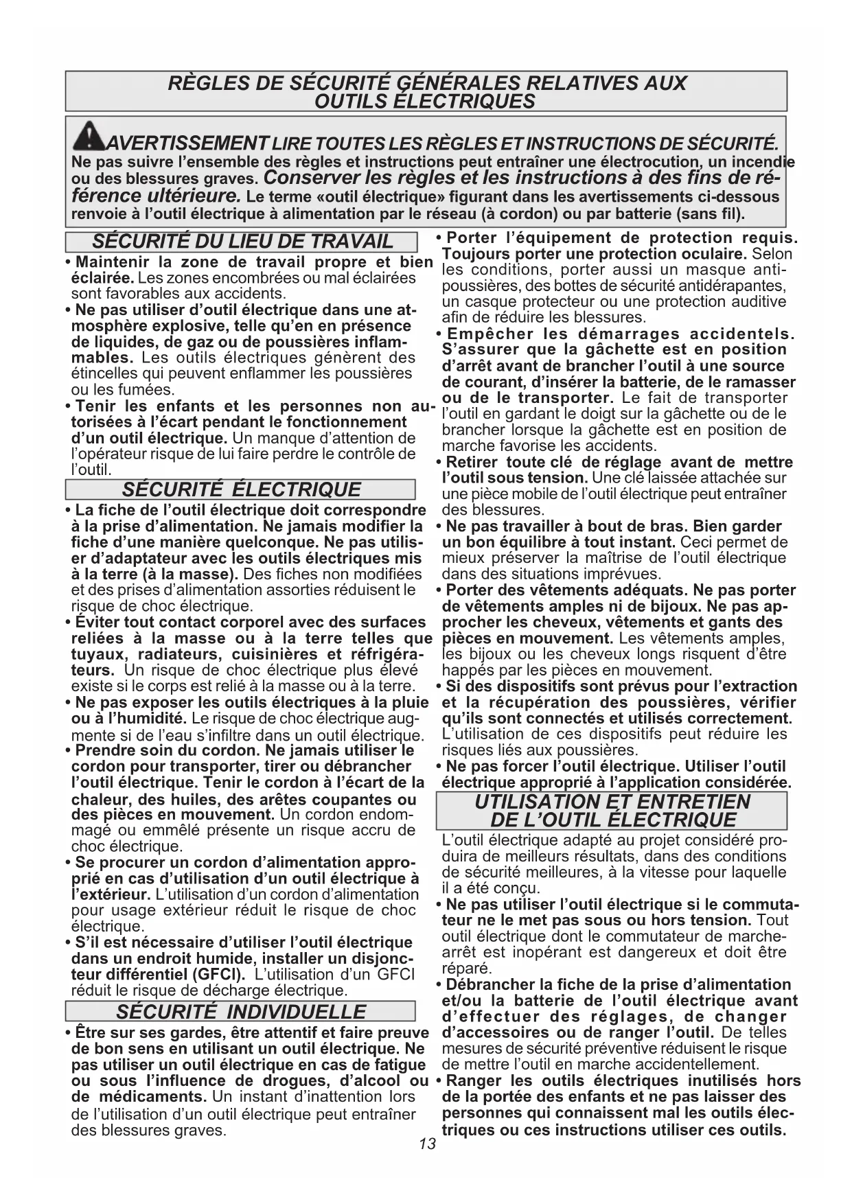 - Entretien des outils électriques. S’assurer de l’absence de tout désalignement ou de grip- page des pièces mobiles, de toute rupture de pièce ou de toute autre condition qui pour- rait affecter le bon fonctionnement de l’outil électrique. En cas de dommages, faire réparer l’outil avant de l’utiliser de nouveau. Les outils électriques mal entretenus sont à la source de nombreux accidents.