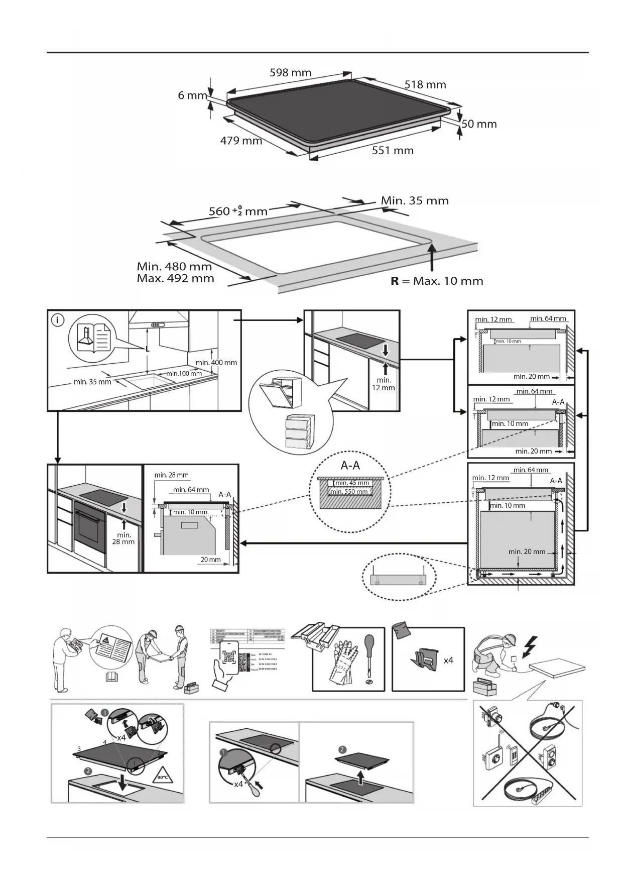 peut générer un son lorsque quelque chose est laissé sur le panneau de commande. Éteignez-la en agissant sur le bouton MARCHE/ARRÊT. INSTALLATION Deux personnes minimum sont nécessaires pour déplacer et installer l’appareil - risque de blessure. Utilisez des gants de protection pour le déballage et l’installation de l’appareil - vous risquez de vous couper. L’installation, incluant l’alimentation en eau (selon le modèle), et les connexions électriques, ainsi que les réparations, doivent être exécutées par un technicien qualié. Ne procédez à aucune réparation ni à aucun remplacement de pièce sur l’appareil autre que ceux spéciquement indiqués dans le guide d’utilisation. Gardez les enfants à l’écart du site d’installation. Après avoir déballé l’appareil, assurez-vous qu’il n’a pas été endommagé pendant le transport. En cas de problème, contactez le détaillant ou le service Après- vente le plus proche. Une fois installé, gardez le matériel d’emballage (sacs en plastique, parties en polystyrène, etc.) hors de la portée des enfants - ils pourraient s’étouer. L’appareil ne doit pas être branché à l’alimentation électrique lors de l’installation - vous pourriez vous électrocuter. Au moment de l’installation, assurez-vous que le câble d’alimentation n’est pas endommagé par l’appareil - risque d’incendie ou de choc électrique. Allumez l’appareil uniquement lorsque l’installation est terminée. Découpez le contour du meuble avant d’y insérer l’appareil, et enlevez soigneusement tous les copeaux et la sciure de bois. ALIMENTATION ÉLECTRIQUE Il doit être possible de débrancher l’appareil de l’alimentation électrique en retirant la che de la prise de courant si elle est accessible, ou à l’aide d’un interrupteur multipolaire en amont de la prise decourant, conformément aux normes de sécurité électrique nationales. Utilisez pas de rallonge, de prises multiples ou d’adaptateurs. Une fois l’installation terminée, l’utilisateur ne devra plus pouvoir accéder aux composantes électriques. N’utilisez pas l’appareil si vous êtes mouillé ou si vous êtes pieds nus. N’utilisez pas l’appareil si le câble d’alimentation ou la prise de courant est endommagé(e), si l’appareil ne fonctionne pas correctement, ou s’il a été endommagé ou est tombé. Une installation utilisant une prise de câble électrique n'est pas autorisée sauf si le produit en est déjà équipé par le Fabricant. Si le câble d’alimentation est endommagé, il doit être remplacé avec un câble identique par le fabricant, un représentant du Service Après-vente, ou par toute autre personne qualiée - vous pourriez vous électrocuter.