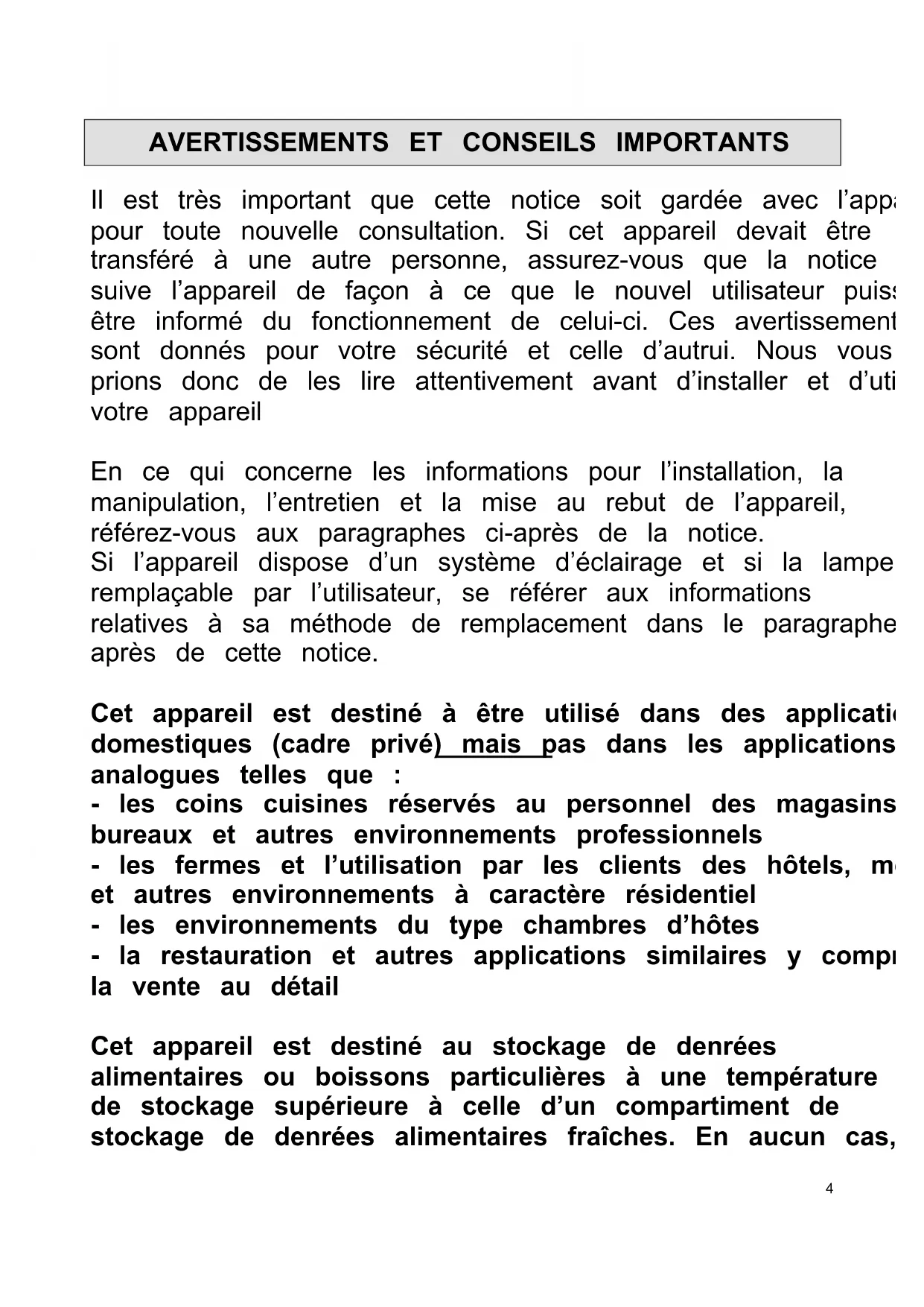 Il est très important que cette notice soit gardée avec l’appareil pour toute nouvelle consultation. Si cet appareil devait être transféré à une autre personne, assurez-vous que la notice suive l’appareil de façon à ce que le nouvel utilisateur puisse être informé du fonctionnement de celui-ci. Ces avertissements sont donnés pour votre sécurité et celle d’autrui. Nous vous prions donc de les lire attentivement avant d’installer et d’utiliser votre appareil En ce qui concerne les informations pour l’installation, la manipulation, l’entretien et la mise au rebut de l’appareil, référez-vous aux paragraphes ci-après de la notice. Si l’appareil dispose d’un système d’éclairage et si la lampe est remplaçable par l’utilisateur, se référer aux informations relatives à sa méthode de remplacement dans le paragraphe ci- après de cette notice. Cet appareil est destiné à être utilisé dans des applications domestiques (cadre privé) mais pas dans les applications analogues telles que : - les coins cuisines réservés au personnel des magasins, bureaux et autres environnements professionnels - les fermes et l’utilisation par les clients des hôtels, motels et autres environnements à caractère résidentiel - les environnements du type chambres d’hôtes - la restauration et autres applications similaires y compris la vente au détail Cet appareil est destiné au stockage de denrées alimentaires ou boissons particulières à une température de stockage supérieure à celle d’un compartiment de stockage de denrées alimentaires fraîches. En aucun cas, il5 n’est destiné à conserver des denrées alimentaires fraîches. Ne l’utilisez pas à des fins commerciales ou industrielles ou pour d’autre but que celui pour lequel il a été conçu. Sécurité Cet appareil peut être utilisé par des enfants âgés d'au moins 8 ans et par des personnes ayant des capacités physiques, sensorielles ou mentales réduites ou dénuées d’expérience ou de connaissance, s'ils (si elles) sont correctement surveillé(e)s ou si des instructions relatives à l'utilisation de l'appareil en toute sécurité leur ont été données et si les risques encourus ont été appréhendés. Les enfants ne doivent pas jouer avec l’appareil. Il convient de maintenir à distance les enfants de moins de 3 ans, à moins qu'ils ne soient sous une surveillance continue. Le nettoyage et l'entretien par l'usager ne doivent pas être effectués par des enfants sans surveillance. Les enfants âgés de 3 à 8 ans sont autorisés à charger et décharger les appareils de réfrigération. Débranchez toujours la prise de courant avant de procéder à son nettoyage ; de procéder à son dégivrage ; de changer la lampe d’éclairage ; de déplacer l’appareil ou de nettoyer le sol sous l’appareil. MISE EN GARDE : Ne pas endommager le circuit de réfrigération. MISE EN GARDE : Ne pas utiliser d'appareils électriques à l'intérieur du compartiment de stockage des denrées, à moins qu'ils ne soient du type recommandé par le fabricant. MISE EN GARDE : Ne pas utiliser de dispositifs mécanique ou autre moyens pour accélérer le processus de dégivrage autres que ceux recommandés par le fabricant.6 MISE EN GARDE : Maintenir dégagées les ouvertures de ventilation dans l'enceinte de l'appareil ou dans la structure d'encastrement. Ne pas brancher l’appareil à une prise de courant non protégée contre les surcharges (fusible). Ne jamais utiliser de prises multiples ou de rallonge pour brancher l’appareil.