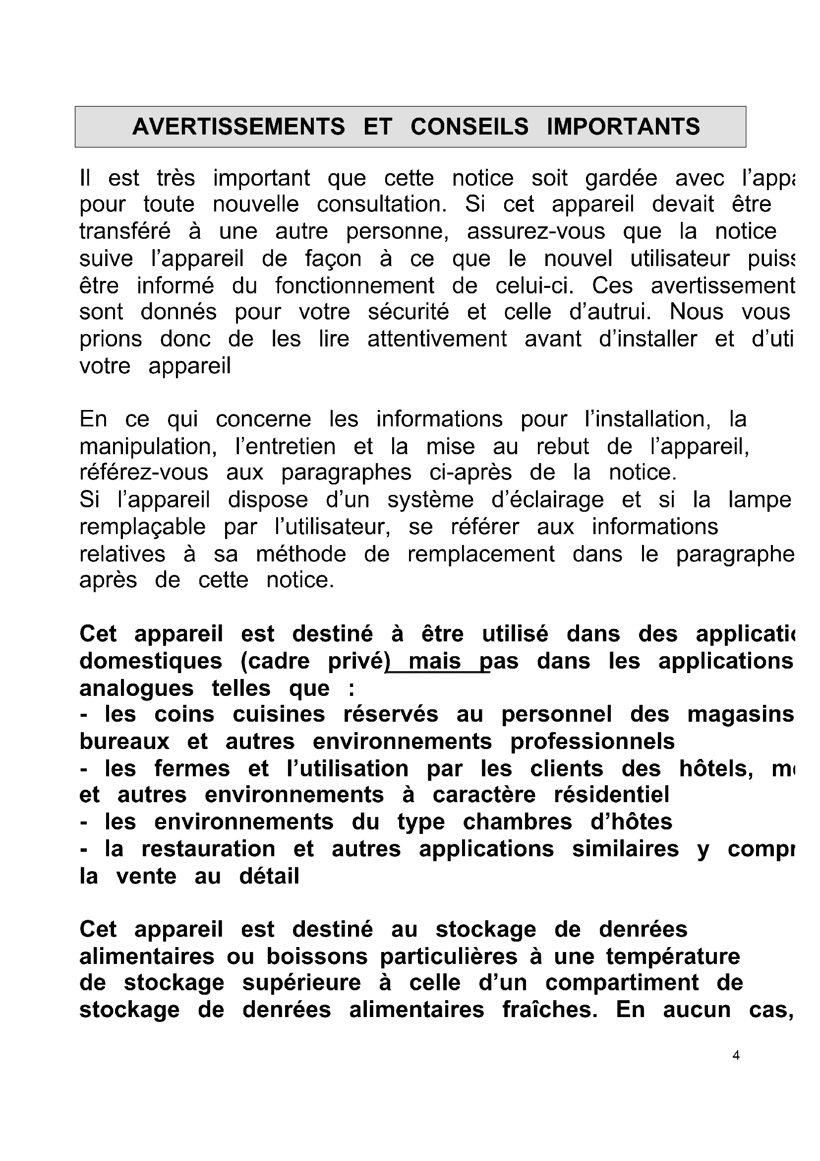 Il est très important que cette notice soit gardée avec l’appareil pour toute nouvelle consultation. Si cet appareil devait être transféré à une autre personne, assurez-vous que la notice suive l’appareil de façon à ce que le nouvel utilisateur puisse être informé du fonctionnement de celui-ci. Ces avertissements sont donnés pour votre sécurité et celle d’autrui. Nous vous prions donc de les lire attentivement avant d’installer et d’utiliser votre appareil En ce qui concerne les informations pour l’installation, la manipulation, l’entretien et la mise au rebut de l’appareil, référez-vous aux paragraphes ci-après de la notice. Si l’appareil dispose d’un système d’éclairage et si la lampe est remplaçable par l’utilisateur, se référer aux informations relatives à sa méthode de remplacement dans le paragraphe ci- après de cette notice. Cet appareil est destiné à être utilisé dans des applications domestiques (cadre privé) mais pas dans les applications analogues telles que : - les coins cuisines réservés au personnel des magasins, bureaux et autres environnements professionnels - les fermes et l’utilisation par les clients des hôtels, motels et autres environnements à caractère résidentiel - les environnements du type chambres d’hôtes - la restauration et autres applications similaires y compris la vente au détail Cet appareil est destiné au stockage de denrées alimentaires ou boissons particulières à une température de stockage supérieure à celle d’un compartiment de stockage de denrées alimentaires fraîches. En aucun cas, il5 n’est destiné à conserver des denrées alimentaires fraîches. Ne l’utilisez pas à des fins commerciales ou industrielles ou pour d’autre but que celui pour lequel il a été conçu. Sécurité Cet appareil peut être utilisé par des enfants âgés d'au moins 8 ans et par des personnes ayant des capacités physiques, sensorielles ou mentales réduites ou dénuées d’expérience ou de connaissance, s'ils (si elles) sont correctement surveillé(e)s ou si des instructions relatives à l'utilisation de l'appareil en toute sécurité leur ont été données et si les risques encourus ont été appréhendés. Les enfants ne doivent pas jouer avec l’appareil. Il convient de maintenir à distance les enfants de moins de 3 ans, à moins qu'ils ne soient sous une surveillance continue. Le nettoyage et l'entretien par l'usager ne doivent pas être effectués par des enfants sans surveillance. Les enfants âgés de 3 à 8 ans sont autorisés à charger et décharger les appareils de réfrigération. Débranchez toujours la prise de courant avant de procéder à son nettoyage ; de procéder à son dégivrage ; de changer la lampe d’éclairage ; de déplacer l’appareil ou de nettoyer le sol sous l’appareil. MISE EN GARDE : Ne pas endommager le circuit de réfrigération. MISE EN GARDE : Ne pas utiliser d'appareils électriques à l'intérieur du compartiment de stockage des denrées, à moins qu'ils ne soient du type recommandé par le fabricant. MISE EN GARDE : Ne pas utiliser de dispositifs mécanique ou autre moyens pour accélérer le processus de dégivrage autres que ceux recommandés par le fabricant.6 MISE EN GARDE : Maintenir dégagées les ouvertures de ventilation dans l'enceinte de l'appareil ou dans la structure d'encastrement. Ne pas brancher l’appareil à une prise de courant non protégée contre les surcharges (fusible). Ne jamais utiliser de prises multiples ou de rallonge pour brancher l’appareil.