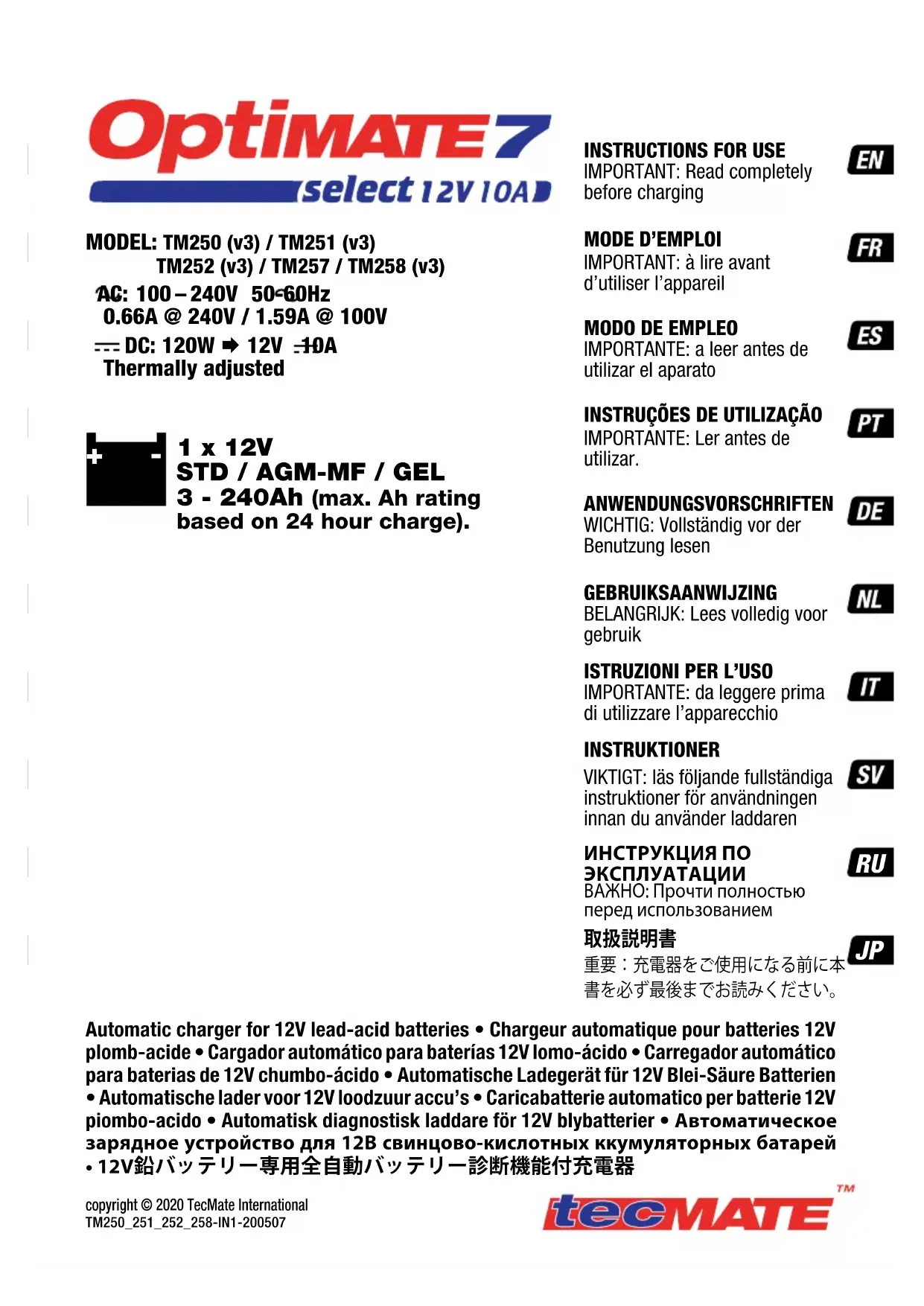 Pour des batteries en bon état, la LED nº6 (verte) reste allumée.Exception: les batteries à électrolyte liquide standard avec bouchons de remplissage présentent une tension inférieure lorsqu'elles sont complètement chargées: la LED nº6 reste allumée, de même que la LED nº7. CHARGE DE MAINTENANCE: LED nº6/7/8 fixes en fonction de l’état de charge mesuré à l’ÉTAPE 8. Réglages de la tension d’annonciation : tension nominale de 13,6 V à 20 °C (68 °F). La tension d’annonciation est inversement régulée en fonction de la température ambiante (elle augmente, par exemple, en cas de température inférieure, et diminue en cas de température supérieure). Réglage : -0,04 V/cellule/°C au-dessus ou en dessous de 20 °C (68 °F). Le MAINTENANCE OPTIMATE24-7 consiste en périodes de charge flottante de 30 minutes suivies par et alternant avec des périodes de repos de 30 minutes durant lesquelles aucun courant de charge n’est délivré. Ce cycle à 50% de charge évite la perte d’électrolyte dans les batteries scellées et réduit au minimum la perte progressive d’eau des batteries à bouchons de remplissage, ce qui contribue de manière significative à l’optimisation de la durée utile de batteries utilisées de manière irrégulière ou saisonnière. Durant les périodes de charge flottante, un petit courant pulsé est continuellement délivré pour prévenir la sulfatation, optimisant encore la puissance et la durée de vie de la batterie. Si l’OptiMate capte une perte de charge de la batterie, le programme passe à nouveau en modeCHARGE. BATTERIES DÉGRADÉES ET TRÈS FAIBLES: Si la batterie est complètement déchargée (et peut-être même sulfatée), retirez-la du véhicule ou de ’equipment et examinez-la avant de la connecter au chargeur pour une tentative de récupération. Le mode récupération TURBO du chargeur ne peut pas s’engager s’il détecte une connexion entre la batterie et le circuit câblé du véhicule ce qui permet une résistance électrique plus faible qu’avec la batterie seule. Cependant, si la batterie complètement déchargée n’est pas retirée pour récupération, ni la batterie, ni le véhicule ou l’equipment ne seront endommagés. Tenir spécialement compte de ce qui suit: Les cellules d’une batterie restée en décharge profonde durant une longue période peuvent être endommagées à titre permanent. Ces batteries peuvent chauffer excessivement durant la charge à courant élevé. Vérifier la température de la batterie durant la première heure, puis chaque heure suivante. Vérifier la présence de signes inhabituels comme des bulles ou fuites d’électrolyte, une activité plus importante d’une cellule par rapport aux autres, ou des sifflements. Si à un12 moment quelconque, la batterie devient trop chaude au toucher ou si vous constatez des signes inhabituels, DÉCONNECTER IMMÉDIATEMENT LE CHARGEUR. MAINTENANCE D’UNE BATTERIE DURANT DES PÉRIODES PROLONGÉES: Pour optimiser la température de charge et l’entretien à long terme, placez OptiMate aussi près que possible de la batterie en charge. Par exemple, si la batterie est dans un navire ou un véhicule garé dehors et exposé au soleil ou au froid, placez OptiMate à l'intérieur du véhicule ou du navire (ou dans le compartiment de la batterie) pour que la tension de charge soit soumise à la même température ambiante que la celle de la batterie.L'OptiMate maintiendra une batterie dont l'état est bon, en toute sécurité durant plusieurs mois. Vérifier au moins une fois par quinzaine la sécurité des connexions entre chargeur et batterie. Dans le cas de batteries équipées de bouchons de remplissage sur chaque cellule, déconnecter la batterie du chargeur, vérifier le niveau d’électrolyte et faire l’appoint si nécessaire (en eau distillée, PAS en acide), puis reconnecter. Lors de la manipulation de batteries ou à proximité de celles-ci, toujours respecter les AVERTISSEMENTS DE SÉCURITÉ ci-dessus. REMARQUES SUR LES RÉSULTATS DU TEST: La tension d’une batterie refroidie est directement proportionnelle à son pourcentage d'état de charge (SOC%). Immédiatement après la charge, une batterie peut maintenir brièvement une tension plus élevée, comme la charge fait augmenter la température des éléments chimiques au sein de la batterie. Une batterie récupérée après une décharge profonde peut avoir besoin de plus de temps pour refroidir et une tension pour régler et refléter son véritable état de charge (SOC%). 1. Pour tout résultat différent d’une LED #6 verte, déconnecter la batterie du système électrique du véhivcule et reconnecter l’OptiMate. Si on obtient ensuite un meilleur résultat, cela indique que les pertes de puissance sont dues en partie à un problème du système électrique et non à la batterie. Si les mauvais résultats persistent, il est conseillé d’amener la batterie dans un atelier professionnel équipé d’appareils de test professionnels pour procéder à une analyse approfondie. 2. Si la LED #8 rouge seule, ou la LED #7 jaune et la LED #7 rouge s’allument en même temps, un problème significatif existe. La batterie est incapable de retenir une charge suffisante ou perd rapidement de la charge en raison d’un circuit connecté. Une charge soudaine allumée lorsque le chargeur est branché peut également entraîner une chute de tension significative sur la batterie. 3. Ce test de rétention de voltage est un résultat significativement probant mais pas nécessairement concluant de la condition de la batterie, qui pour une batterie à cycles profonds peut être établie plus précisément à l’aide d’un testeur de charge de précision TestMate 12V Deep Cycle. Des connexions intercellulaires dégradées ou une mauvaise connexion externe au niveau des bornes de la batterie peuvent provoquer une chute de tension importante lorsqu’un courant élevé est exigé à la batter