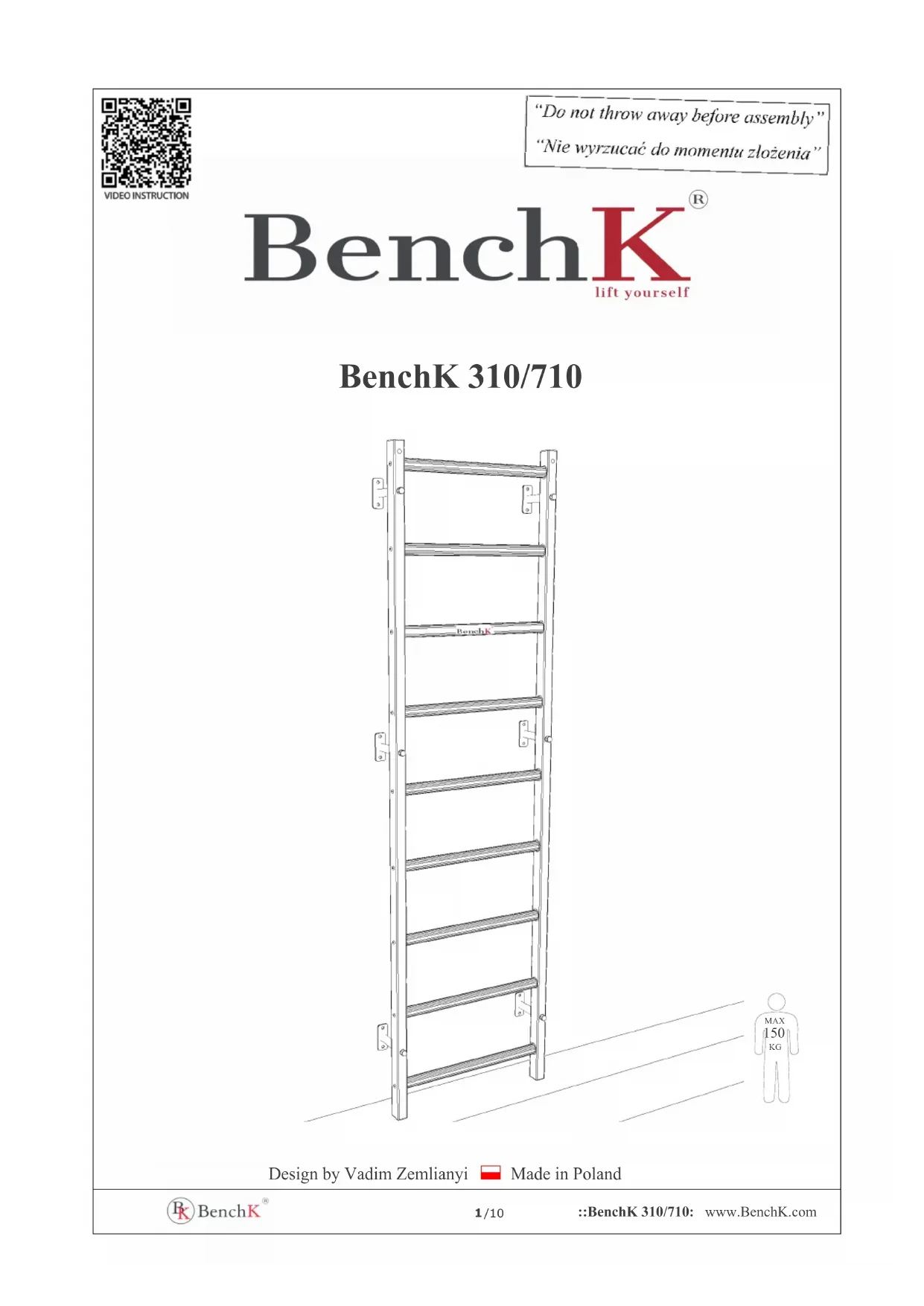 Consignes de sécurité - Une seule personne à la fois peut s'exercer sur l’échelle de gymnastique BenchK 310/710. - Avant chaque exercice, vérifiez l'état du BenchK 310/710 - fixations et autres composants. - Le produit ne doit être fixé qu'à des surfaces verticales (murs) de structure et de résistance adéquates, en tenant compte du poids du produit et du poids de l'utilisateur. - Les enfants âgés de 0 à 3 ans ne peuvent pas utiliser l’échelle BenchK 310/710. - Les personnes âgés de 3 à 14 ans peuvent utiliser l'appareil sous la surveillance d'un adulte. - Le poids maximal de l'utilisateur de l’échelle de gymnastique BenchK 310/710 est de 150 kg. - Assurez-vous qu'il y ait suffisamment d'espace autour de l'échelle de gymnastique pour effectuer les exercices en toute sécurité. - Utilisez un matelas ou un tapis d'exercice pour minimiser le risque de blessure. - Pour l'entretien, essuyez l’échelle avec un chiffon sec ou légèrement humide. - En cas de démontage, stockez l’échelle de gymnastique BenchK 110 dans un local sec et peu humide. - Le niveau de difficulté et l'intensité des exercices doivent être choisis en fonction de l'état de santé et de la condition de la personne qui les pratique. Évitez les efforts excessifs pendant l'exercice. Garantie du fabricant : - Le fabricant garantit à l'acheteur la conservation de tous les indicateurs de qualité dans un délai de 10 ans pour les composants métalliques et dans un délai de 24 mois pour les autres composants, à compter de la date d'achat, à condition que les règles d'installation et d'utilisation soient respectées. - En cas de dommages mécaniques survenus pendant le transport, le montage ou l'utilisation de l’échelle par l'acheteur, le vendeur décline toute responsabilité. - Si vous constatez des défauts ou des composants de mauvaise qualité qui ne sont pas de la responsabilité de l'acheteur, veuillez contacter le service clientèle de Benchmark (biuro@benchk.com). Remarques : En raison de l'amélioration continue du BenchK 310/710, des modifications mineures de la conception sont possibles, mais elles ne réduisent pas la qualité. Les goujons et les vis ne sont pas incluses. Leur type doit être choisi en fonction du type de mur sur lequel l'échelle de gymnastique sera fixée. Le produit répond aux exigences de sécurité contenues dans les normes PN-EN 12346:2001, PN-EN 913:2019-03./10 ::BenchK 310/710: www.BenchK.com 585 mm 665 mm 105 mm 235 mm 2400 mm 265 mm 1367 mm 2244 mm 154 mm Ø10mm x 2
