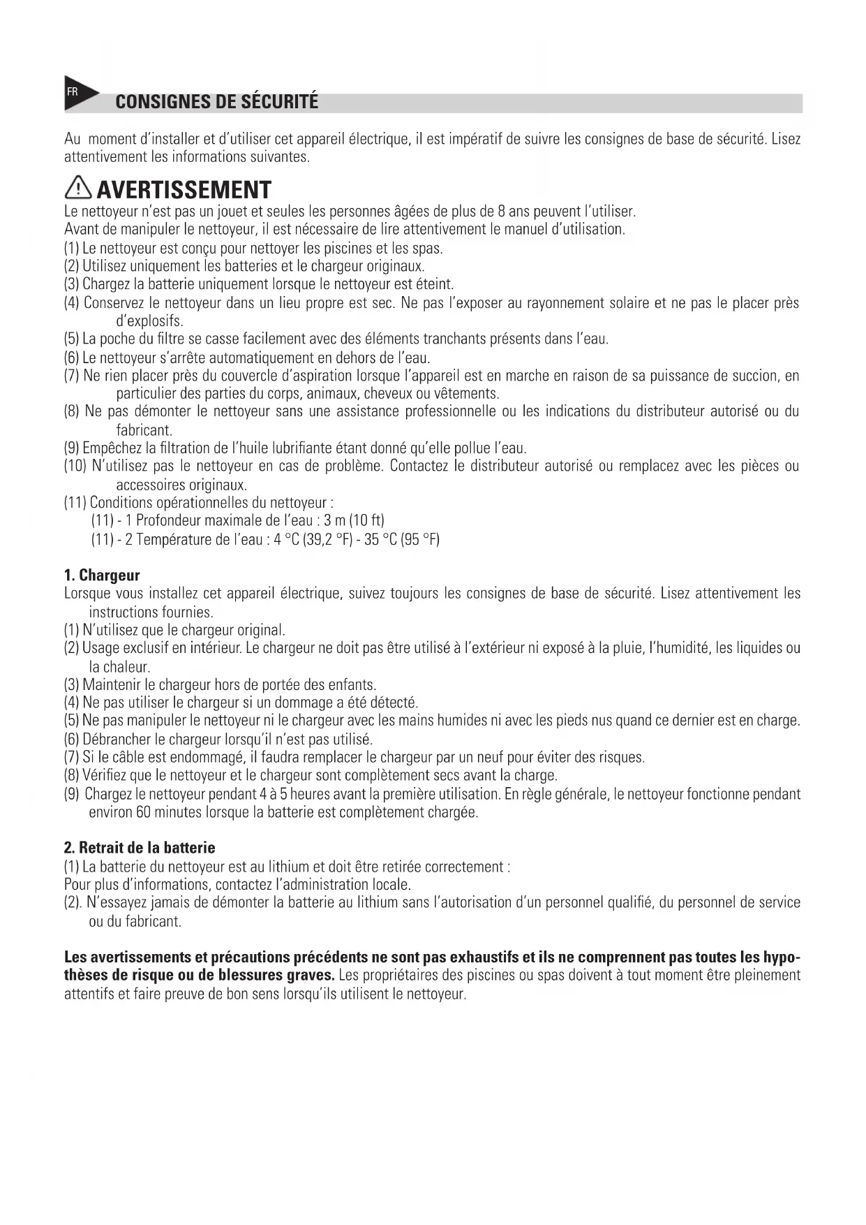 Au moment d’installer et d’utiliser cet appareil électrique, il est impératif de suivre les consignes de base de sécurité. Lisez attentivement les informations suivantes. AVERTISSEMENT Le nettoyeur n’est pas un jouet et seules les personnes âgées de plus de 8 ans peuvent l’utiliser. Avant de manipuler le nettoyeur, il est nécessaire de lire attentivement le manuel d’utilisation. (1) Le nettoyeur est conçu pour nettoyer les piscines et les spas. (2) Utilisez uniquement les batteries et le chargeur originaux. (3) Chargez la batterie uniquement lorsque le nettoyeur est éteint. (4) Conservez le nettoyeur dans un lieu propre est sec. Ne pas l’exposer au rayonnement solaire et ne pas le placer près d’explosifs. (5) La poche du filtre se casse facilement avec des éléments tranchants présents dans l’eau. (6) Le nettoyeur s’arrête automatiquement en dehors de l’eau. (7) Ne rien placer près du couvercle d’aspiration lorsque l’appareil est en marche en raison de sa puissance de succion, en particulier des parties du corps, animaux, cheveux ou vêtements. (8) Ne pas démonter le nettoyeur sans une assistance professionnelle ou les indications du distributeur autorisé ou du fabricant. (9) Empêchez la filtration de l’huile lubrifiante étant donné qu’elle pollue l’eau. (10) N’utilisez pas le nettoyeur en cas de problème. Contactez le distributeur autorisé ou remplacez avec les pièces ou accessoires originaux. (11) Conditions opérationnelles du nettoyeur : (11) - 1 Profondeur maximale de l’eau : 3m (10ft) (11) - 2 Température de l’eau : 4°C (39,2°F) - 35°C (95°F)