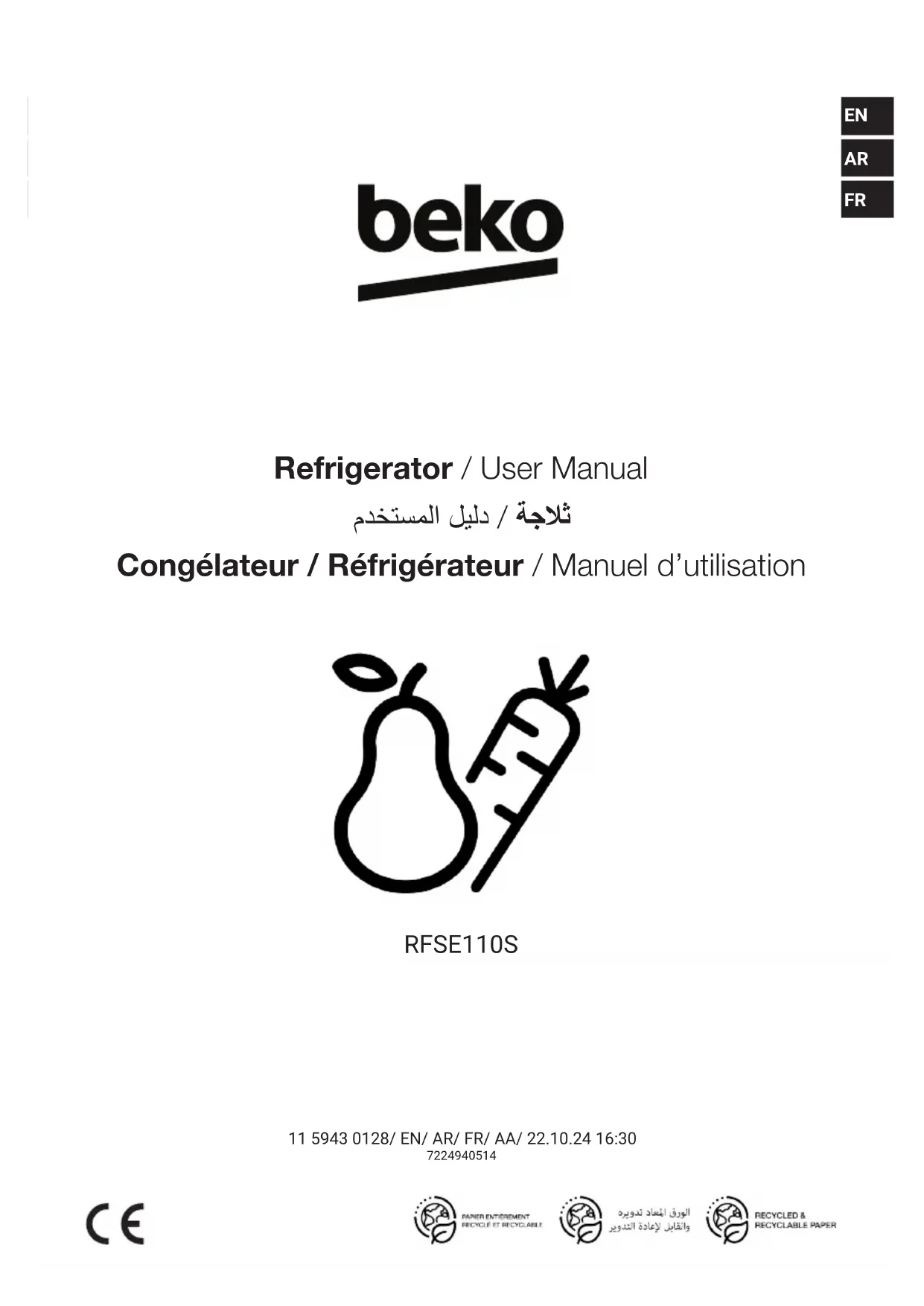 Congélateur / Réfrigérateur / Manuel d’utilisation RFSE110S 11 5943 0128/ EN/ AR/ FR/ AA/ 22.10.24 16:30