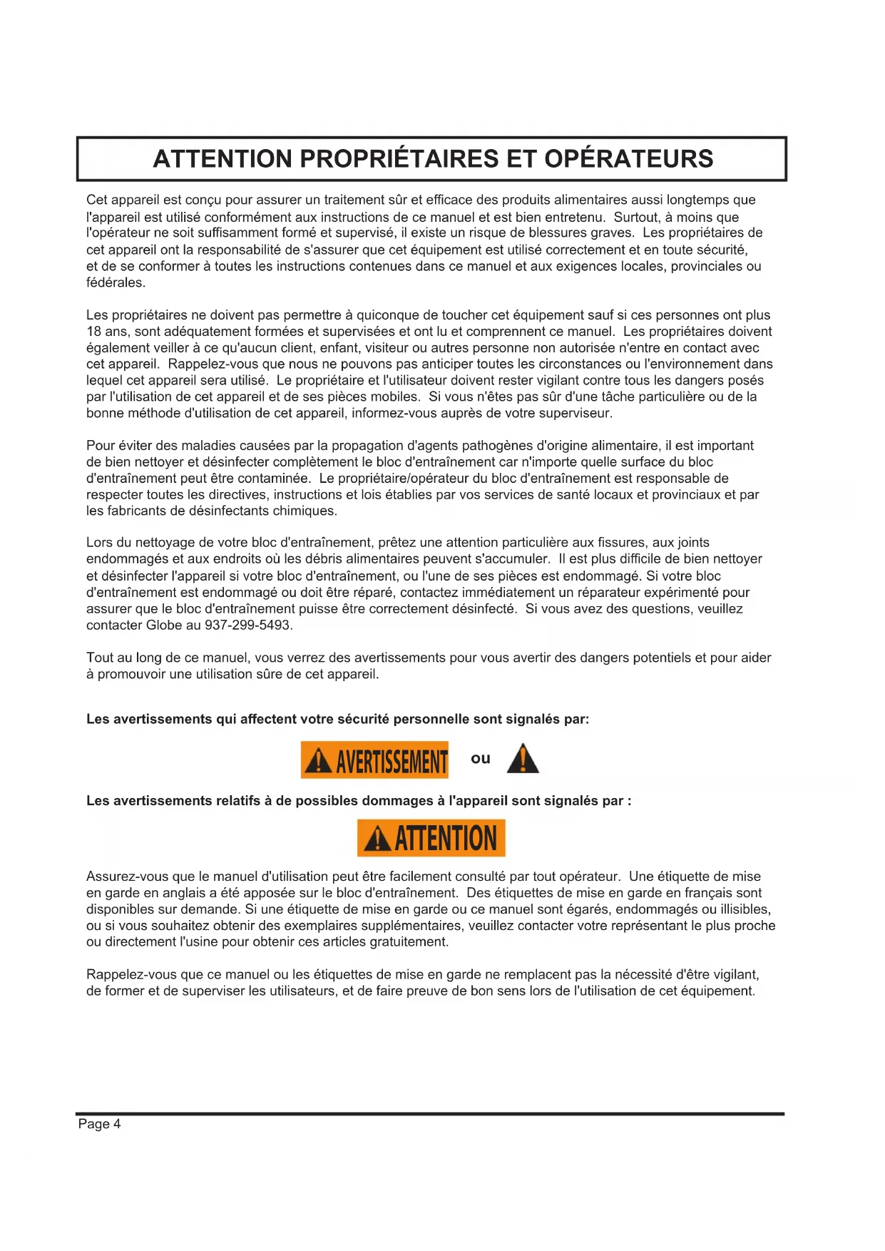 COURRIEL : info@globefoodequip.com SITE WEB : www.globefoodequip.com © Globe Food Equipment Company, 2019 Imprimé aux États-Unis 980208 12/03/2019 Ver 0_Rev. A TABLES DES MATIÈRESPage 4 Cet appareil est conçu pour assurer un traitement sûr et ecace des produits alimentaires aussi longtemps que l'appareil est utilisé conformément aux instructions de ce manuel et est bien entretenu. Surtout, à moins que l'opérateur ne soit susamment formé et supervisé, il existe un risque de blessures graves. Les propriétaires de cet appareil ont la responsabilité de s'assurer que cet équipement est utilisé correctement et en toute sécurité, et de se conformer à toutes les instructions contenues dans ce manuel et aux exigences locales, provinciales ou fédérales. Les propriétaires ne doivent pas permettre à quiconque de toucher cet équipement sauf si ces personnes ont plus 18 ans, sont adéquatement formées et supervisées et ont lu et comprennent ce manuel. Les propriétaires doivent également veiller à ce qu'aucun client, enfant, visiteur ou autres personne non autorisée n'entre en contact avec cet appareil. Rappelez-vous que nous ne pouvons pas anticiper toutes les circonstances ou l'environnement dans lequel cet appareil sera utilisé. Le propriétaire et l'utilisateur doivent rester vigilant contre tous les dangers posés par l'utilisation de cet appareil et de ses pièces mobiles. Si vous n'êtes pas sûr d'une tâche particulière ou de la bonne méthode d'utilisation de cet appareil, informez-vous auprès de votre superviseur. Pour éviter des maladies causées par la propagation d'agents pathogènes d'origine alimentaire, il est important de bien nettoyer et désinfecter complètement le bloc d'entraînement car n'importe quelle surface du bloc d'entraînement peut être contaminée. Le propriétaire/opérateur du bloc d'entraînement est responsable de respecter toutes les directives, instructions et lois établies par vos services de santé locaux et provinciaux et par les fabricants de désinfectants chimiques. Lors du nettoyage de votre bloc d'entraînement, prêtez une attention particulière aux ssures, aux joints endommagés et aux endroits où les débris alimentaires peuvent s'accumuler. Il est plus dicile de bien nettoyer et désinfecter l'appareil si votre bloc d'entraînement, ou l'une de ses pièces est endommagé. Si votre bloc d'entraînement est endommagé ou doit être réparé, contactez immédiatement un réparateur expérimenté pour assurer que le bloc d'entraînement puisse être correctement désinfecté. Si vous avez des questions, veuillez contacter Globe au 937-299-5493. Tout au long de ce manuel, vous verrez des avertissements pour vous avertir des dangers potentiels et pour aider à promouvoir une utilisation sûre de cet appareil. Les avertissements qui aectent votre sécurité personnelle sont signalés par: Les avertissements relatifs à de possibles dommages à l'appareil sont signalés par : Assurez-vous que le manuel d'utilisation peut être facilement consulté par tout opérateur. Une étiquette de mise en garde en anglais a été apposée sur le bloc d'entraînement. Des étiquettes de mise en garde en français sont disponibles sur demande. Si une étiquette de mise en garde ou ce manuel sont égarés, endommagés ou illisibles, ou si vous souhaitez obtenir des exemplaires supplémentaires, veuillez contacter votre représentant le plus proche ou directement l'usine pour obtenir ces articles gratuitement. Rappelez-vous que ce manuel ou les étiquettes de mise en garde ne remplacent pas la nécessité d'être vigilant, de former et de superviser les utilisateurs, et de faire preuve de bon sens lors de l'utilisation de cet équipement.