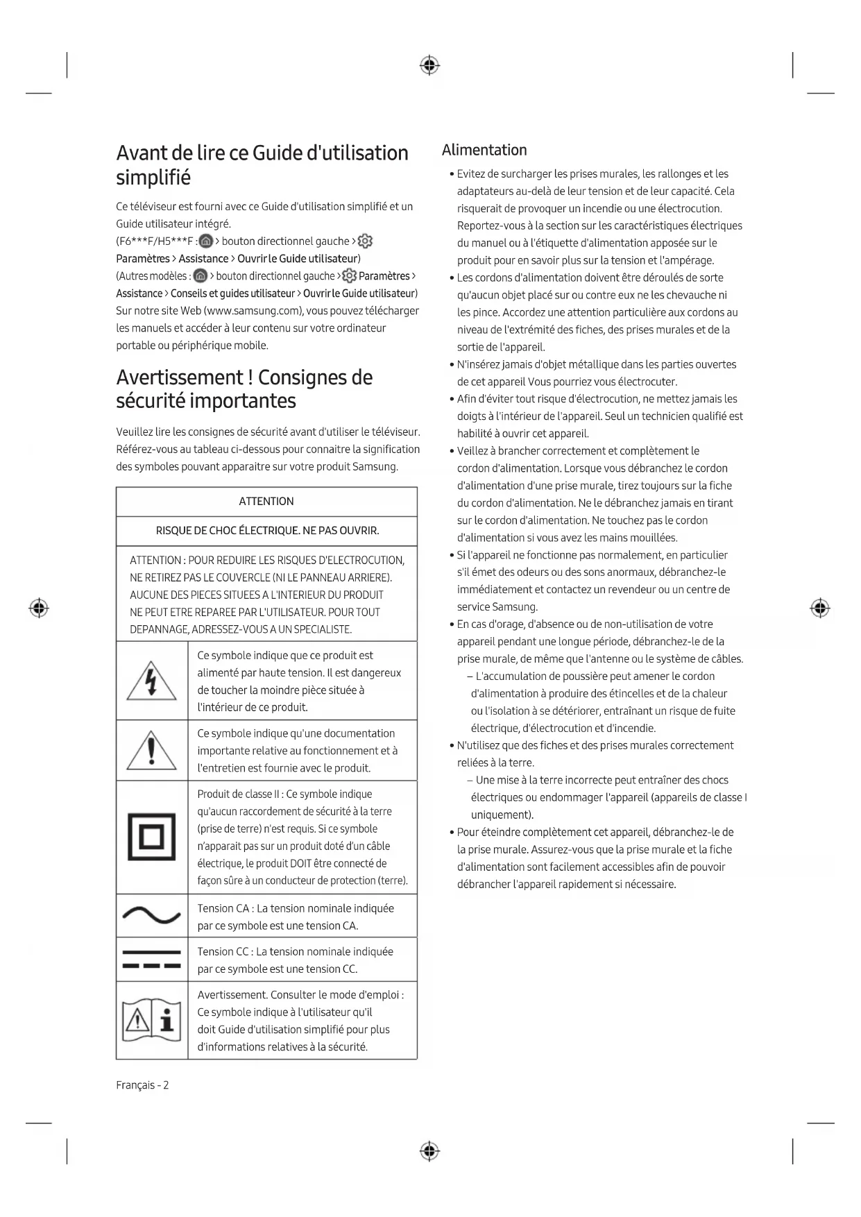 - Pour éteindre complètement cet appareil, débranchez-le de la prise murale. Assurez-vous que la prise murale et la fiche d'alimentation sont facilement accessibles afin de pouvoir débrancher l'appareil rapidement si nécessaire. Avant de lire ce Guide d'utilisation simplifié Ce téléviseur est fourni avec ce Guide d'utilisation simplifié et un Guide utilisateur intégré. (F6***F/H5***F : > bouton directionnel gauche > Paramètres > Assistance > Ouvrir le Guide utilisateur) (Autres modèles: > bouton directionnel gauche > Paramètres > Assistance > Conseils et guides utilisateur > Ouvrir le Guide utilisateur) Sur notre site Web (www.samsung.com), vous pouvez télécharger les manuels et accéder à leur contenu sur votre ordinateur portable ou périphérique mobile. Avertissement! Consignes de sécurité importantes Veuillez lire les consignes de sécurité avant d'utiliser le téléviseur. Référez-vous au tableau ci-dessous pour connaitre la signification des symboles pouvant apparaitre sur votre produit Samsung. ATTENTION RISQUE DE CHOC ÉLECTRIQUE. NE PAS OUVRIR. ATTENTION: POUR REDUIRE LES RISQUES D'ELECTROCUTION, NE RETIREZ PAS LE COUVERCLE (NI LE PANNEAU ARRIERE). AUCUNE DES PIECES SITUEES A L'INTERIEUR DU PRODUIT NE PEUT ETRE REPAREE PAR L'UTILISATEUR. POUR TOUT DEPANNAGE, ADRESSEZ-VOUS A UN SPECIALISTE. Ce symbole indique que ce produit est alimenté par haute tension. Il est dangereux de toucher la moindre pièce située à l'intérieur de ce produit. Ce symbole indique qu'une documentation importante relative au fonctionnement et à l'entretien est fournie avec le produit. Produit de classeII: Ce symbole indique qu'aucun raccordement de sécurité à la terre (prise de terre) n'est requis. Si ce symbole n’apparait pas sur un produit doté d’un câble électrique, le produit DOIT être connecté de façon sûre à un conducteur de protection (terre). Tension CA: La tension nominale indiquée par ce symbole est une tension CA. Tension CC: La tension nominale indiquée par ce symbole est une tension CC. Avertissement. Consulter le mode d'emploi: Ce symbole indique à l'utilisateur qu'il doit Guide d'utilisation simplifié pour plus d'informations relatives à la sécurité. Français Français - 2Installation