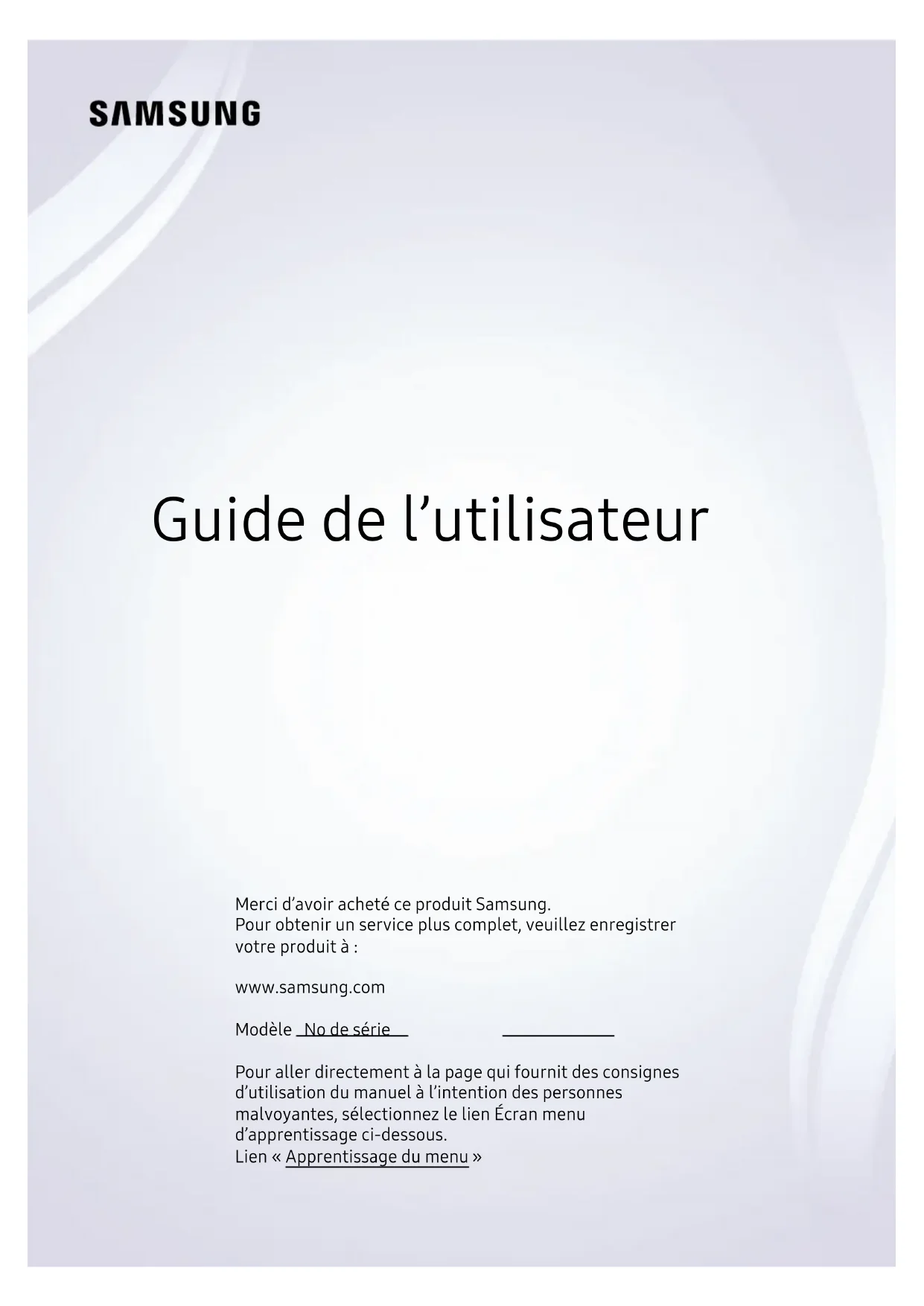Guide de l’utilisateur Merci d’avoir acheté ce produit Samsung. Pour obtenir un service plus complet, veuillez enregistrer votre produit à : www.samsung.com Modèle No de série Pour aller directement à la page qui fournit des consignes d’utilisation du manuel à l’intention des personnes malvoyantes, sélectionnez le lien Écran menu d’apprentissage ci-dessous. Lien « Apprentissage du menu »Table des matières Guide Connexions