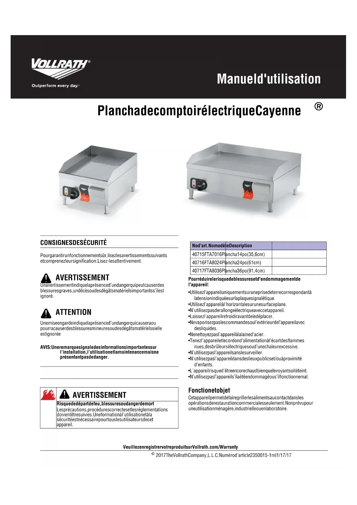 - N’utilisez pas l’appareil s’il a été endommagé ou s’il fonctionne mal. Fonction et objet Cet appareil permet de faire griller les aliments au contact dans les opérations de restauration commerciales seulement. Non prévu pour une utilisation ménagère, industrielle ou en laboratoire. AVERTISSEMENT ATTENTION AVERTISSEMENT Risque de départ de feu, blessures ou danger de mort Les précautions, procédures correctes et les réglementations doivent être suivies. Une formation à l'utilisation et à la sécurité est nécessaire pour tous les utilisateurs de cet appareil. No d'art. No modèle Description 40715 FTA7016 Plancha 14 po (35,6 cm) 40716 FTA8024 Plancha 24 po (61 cm) 40717 FTA8036 Plancha 36 po (91,4 cm)2 Plancha de comptoir électrique Cayenne