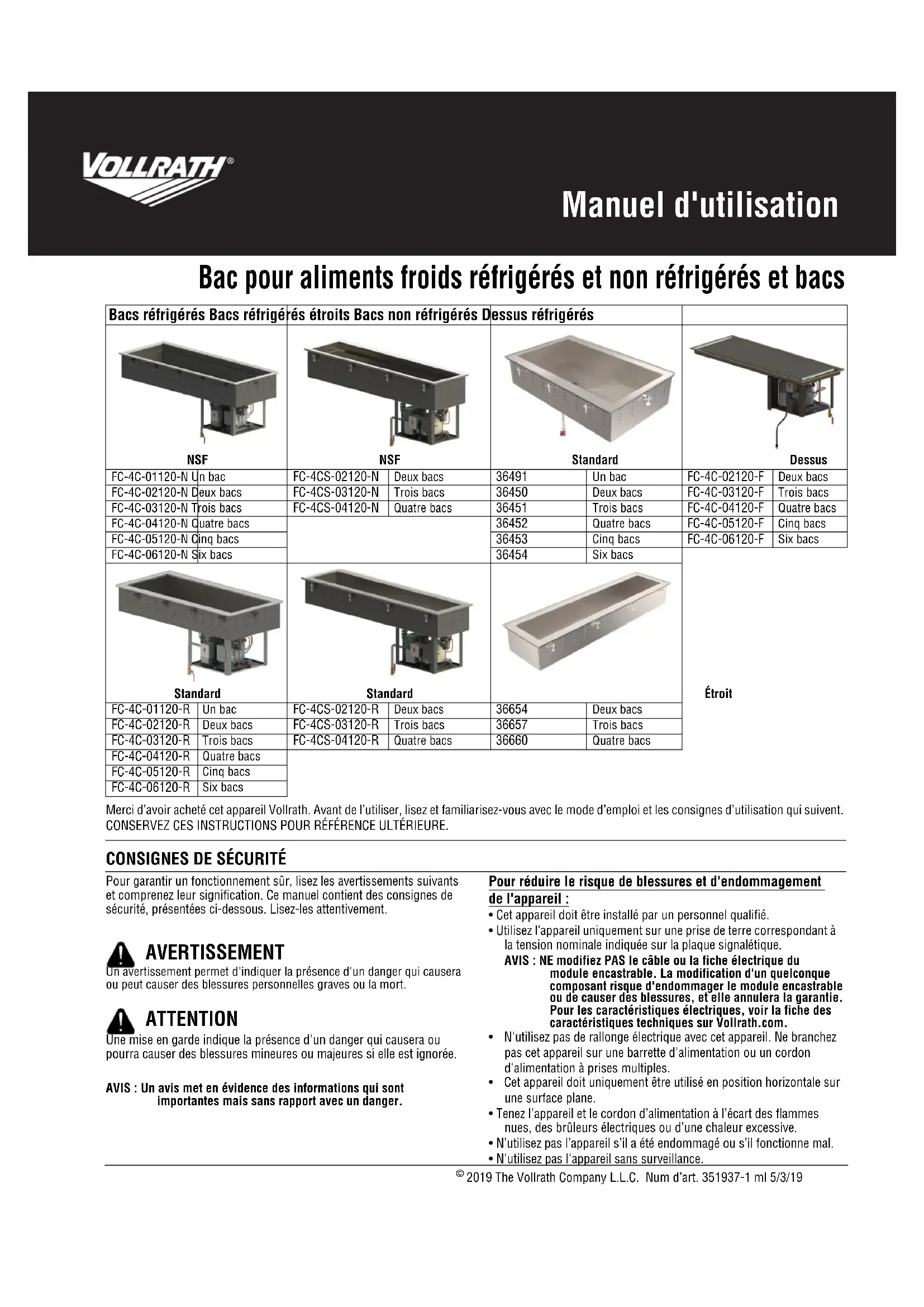| Vollrath® www.vollrath.com | The Vollrath Company, L.L.C. 1236 North 18th Street Sheboygan, WI 53081-3201 États-Unis Standard: 800.624.2051 ou 920.457.4851 Télécopier: 800.752.5620 ou 920.459.6573 Service clientèle: 800.628.0830 Service clientèle Canada: 800.695.8560 | Services techniques: techservicereps@vollrathco.com Produits à induction: 800.825.6036 Réchauds de comptoir: 800.354.1970 Grille-pains: 800-309-2250 Tous les autres produits: 800.628.0832 |
