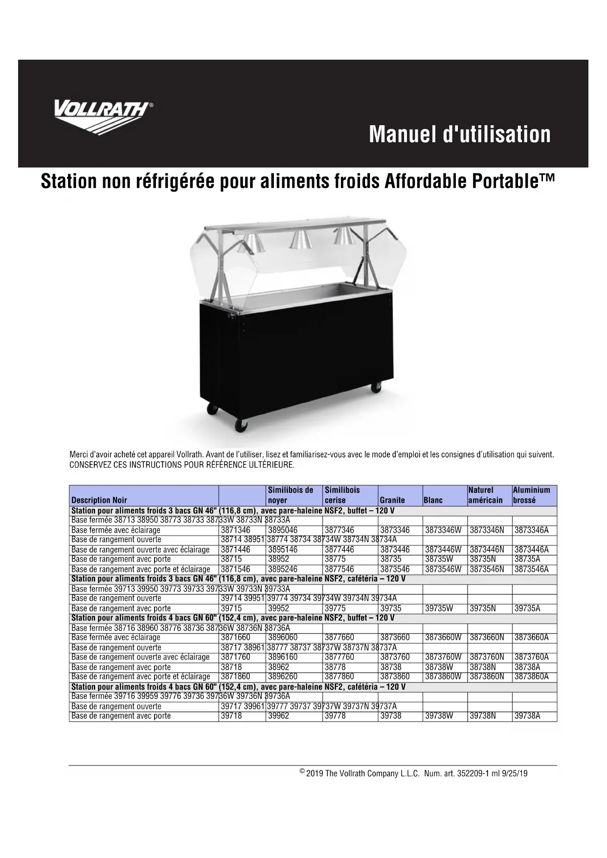 2019 The Vollrath Company L.L.C. Num. art. 352209-1 ml 9/25/19 Merci d’avoir acheté cet appareil Vollrath. Avant de l’utiliser, lisez et familiarisez-vous avec le mode d’emploi et les consignes d’utilisation qui suivent. CONSERVEZ CES INSTRUCTIONS POUR RÉFÉRENCE ULTÉRIEURE. Description Noir Similibois de noyer Similibois cerise Granite Blanc Naturel américain Aluminium brossé Station pour aliments froids 3 bacs GN 46" (116,8 cm), avec pare-haleine NSF2, buffet – 120 V Base fermée 38713 38950 38773 38733 38733W 38733N 38733A Base fermée avec éclairage 3871346 3895046 3877346 3873346 3873346W 3873346N 3873346A Base de rangement ouverte 38714 38951 38774 38734 38734W 38734N 38734A Base de rangement ouverte avec éclairage 3871446 3895146 3877446 3873446 3873446W 3873446N 3873446A Base de rangement avec porte 38715 38952 38775 38735 38735W 38735N 38735A Base de rangement avec porte et éclairage 3871546 3895246 3877546 3873546 3873546W 3873546N 3873546A Station pour aliments froids 3 bacs GN 46" (116,8 cm), avec pare-haleine NSF2, cafétéria – 120 V Base fermée 39713 39950 39773 39733 39733W 39733N 39733A Base de rangement ouverte 39714 39951 39774 39734 39734W 39734N 39734A Base de rangement avec porte 39715 39952 39775 39735 39735W 39735N 39735A Station pour aliments froids 4 bacs GN 60" (152,4 cm), avec pare-haleine NSF2, buffet – 120 V Base fermée 38716 38960 38776 38736 38736W 38736N 38736A Base fermée avec éclairage 3871660 3896060 3877660 3873660 3873660W 3873660N 3873660A Base de rangement ouverte 38717 38961 38777 38737 38737W 38737N 38737A Base de rangement ouverte avec éclairage 3871760 3896160 3877760 3873760 3873760W 3873760N 3873760A Base de rangement avec porte 38718 38962 38778 38738 38738W 38738N 38738A Base de rangement avec porte et éclairage 3871860 3896260 3877860 3873860 3873860W 3873860N 3873860A Station pour aliments froids 4 bacs GN 60" (152,4 cm), avec pare-haleine NSF2, cafétéria – 120 V Base fermée 39716 39959 39776 39736 39736W 39736N 39736A Base de rangement ouverte 39717 39961 39777 39737 39737W 39737N 39737A Base de rangement avec porte 39718 39962 39778 39738 39738W 39738N 39738A2 Manuel d'utilisation de la station non réfrigérée pour aliments froids Affordable Portable™