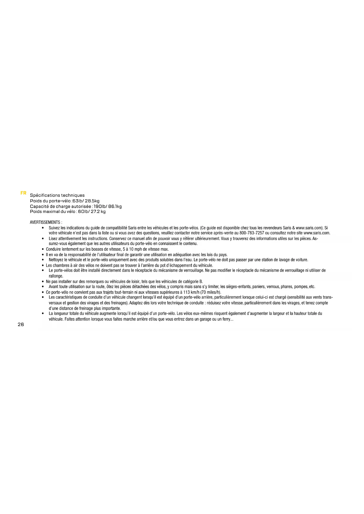 - Saris ne pourra en aucun cas être tenu responsable des blessures personnelles ou dommages indirects à des biens ou possessions, résultant d’une installation ou d’une utilisation incorrecte.