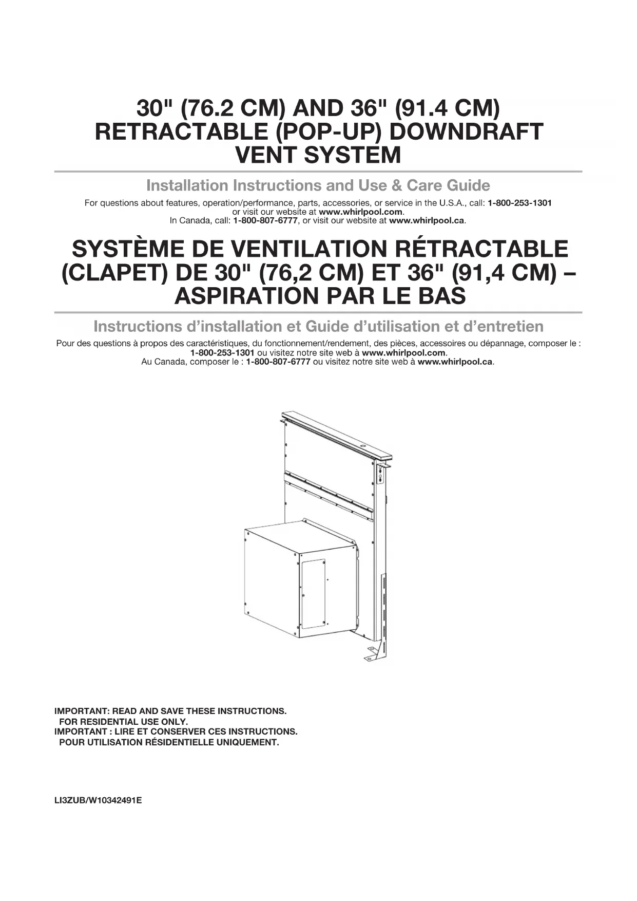 Instructions d’installation et Guide d’utilisation et d’entretien Pour des questions à propos des caractéristiques, du fonctionnement/rendement, des pièces, accessoires ou dépannage, composer le : 1-800-253-1301 ou visitez notre site web à www.whirlpool.com. Au Canada, composer le : 1-800-807-6777 ou visitez notre site web à www.whirlpool.ca. IMPORTANT: READ AND SAVE THESE INSTRUCTIONS. FOR RESIDENTIAL USE ONLY. IMPORTANT : LIRE ET CONSERVER CES INSTRUCTIONS.