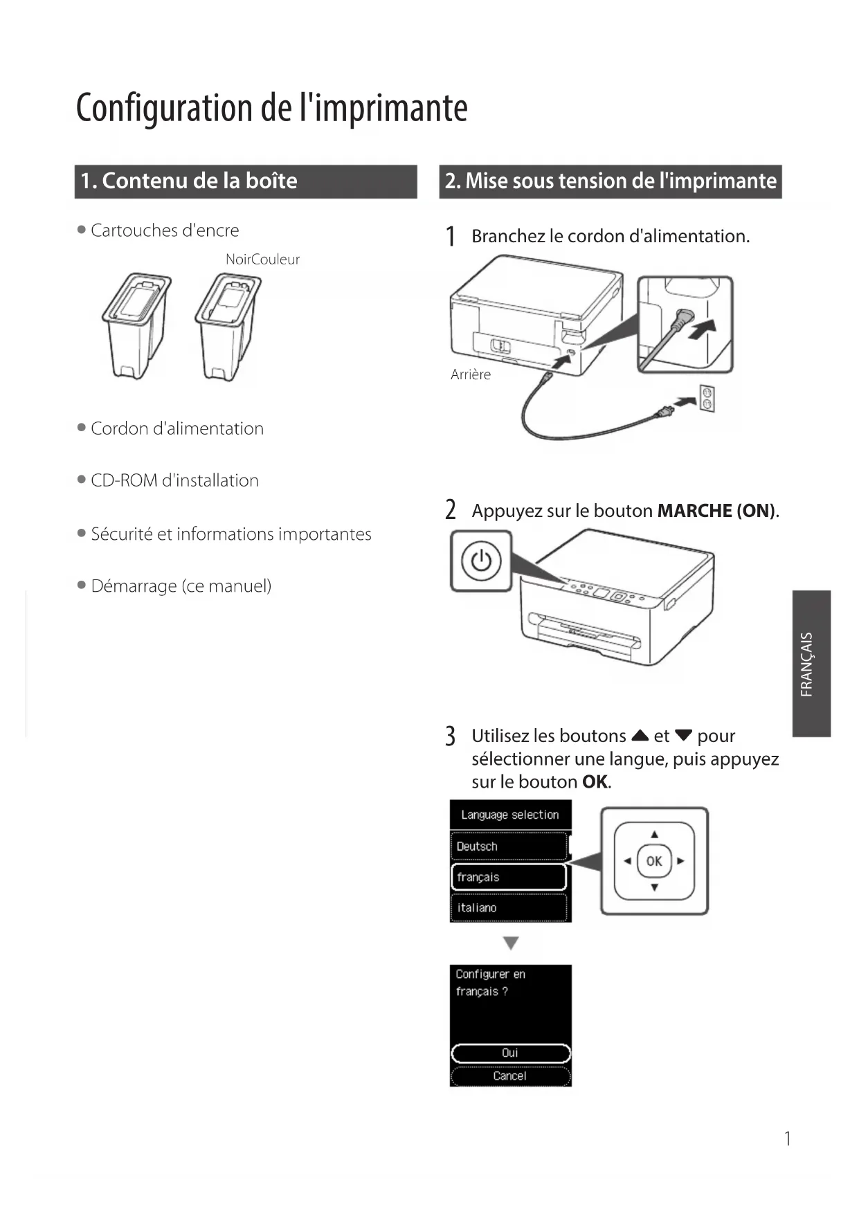 Branchez le cordon d'alimentation.Arrière Appuyez sur le bouton MARCHE (ON). Utilisez les boutons { et } pour sélectionner une langue, puis appuyez sur le bouton OK.2