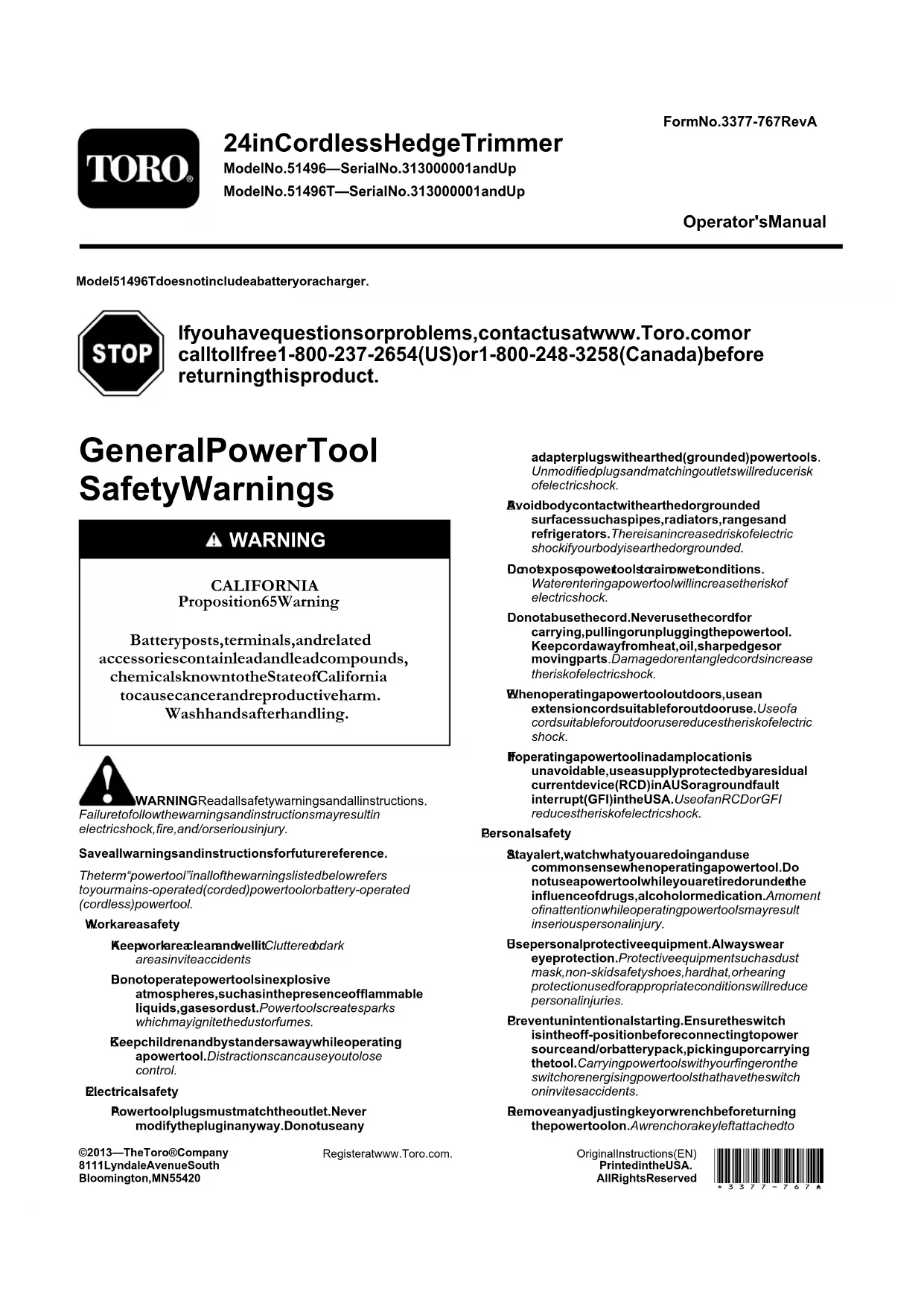 - Manténgaloalejadodeagentescorrosivoscomoproductos químicosdejardínosalparadeshielo. Solucióndeproblemas Elusodelabateríacuandoestácalientepuedereducireltiempodefuncionamiento.Labateríadejarádefuncionarautomáticamentesisesobrecalienta,paraevitarqueseproduzcandaños.Retirelabateríadelcargadorydejequeseenfríeantesdeinstalarladenuevoenladesbrozadora.Elusodelabateríacuandohayhumedadenloscablespuedehacerqueladesbrozadoranofuncionecorrectamente.Dejequelabateríasesequeoséquelaconunpañoantesdevolveracolocarlaenladesbrozadora. 7LaPromesaToro–Productoseléctricos GarantíacompletadedosañosparaelusoresidencialenEstadosUnidosyCanadá TheToroCompanyysualiado,ToroWarrantyCompany,bajounacuerdoentresí,garantizanconjuntamenteesteproductodurantedosañoscontra defectosdematerialesomanodeobracuandoseutilizaconpropósitosresidencialesnormales.* SiustedcreequesuproductoTorotieneundefectodematerialesodemanodeobra,sitienealgunapreguntaoalgúnproblema,yantesdedevolver esteproducto,llamealteléfonogratuito: Desbrozadoras: Sopladores: Lanzanieves: 1-800-237-2654(EE.UU.) 1-800-248-3258(Canadá) 1-888-367-6631(EE.UU.) 1-888-430-1687(Canadá) 1-800-574-3312(México) 1-800-808-2963(US) 1-800-808-3072(Canadá) Parasustituirorepararelproducto,anuestradiscreción,devuelvalaunidadcompletaalvendedor.LosclientesdeEstadosUnidosyCanadápueden devolversuproducto,conpruebadecompra,acualquierServicioTécnicoAutorizado.LosclientesdeEstadosUnidostambiénpuedendevolversu producto,conpruebadecomprayconportespagados,alToroServiceCenter,5500SEDelaware,Ankeny,IA50021. Estagarantíacubredefectosdelproductosolamente.NiTheToroCompanyniToroWarrantyCompanysonresponsablesdedañosindirectos, incidentalesoconsecuentesenconexiónconelusodelosproductosTorocubiertosporestagarantía,incluyendocualquiercosteo gastoporlaprovisióndeequiposdesustituciónoservicioduranteperiodosrazonablesdemalfuncionamientoonoutilizaciónhastala terminacióndelasreparacionesbajoestagarantía.Algunosestadosnopermitenexclusionesdedañosincidentalesoconsecuentes,de maneraquelasexclusionesarribacitadaspuedennoseraplicablesausted.Estagarantíaleotorgaaustedderechoslegalesespecícos;es posiblequeustedtengaotrosderechosquevaríandeunestadoaotro. PaísesfueradeEstadosUnidosyCanadá LosclientesquecompraronproductosToroexportadosdelosEstadosUnidosoCanadádebenponerseencontactoconsuDistribuidor (Concesionario)Toroparaobtenerpólizasdegarantíaparasupaís,provinciaoestado.Siporcualquierrazónustednoestásatisfechoconelservicio ofrecidoporsuDistribuidor,ositienedicultadenobtenerinformaciónsobrelagarantía,póngaseencontactoconelimportadorToro.Sifallantodos losdemásrecursos,puedeponerseencontactoconnosotrosenlaToroWarrantyCompany. LeydeConsumodeAustralia LosclientesaustralianosencontraráninformaciónsobrelaLeydeConsumodeAustraliadentrodelacajaoatravésdesuconcesionarioTorolocal. *"Usoresidencial"signicaelusodelproductoenlamismaparcelaenqueseencuentrasuvivienda.Númerodepieza374-0262Rev.D 374-0262RevDFormNo.3377-767RevA Taille-haiesanslde61cm(24pouces) N°demodèle51496—N°desérie313000001etsuivants N°demodèle51496T—N°desérie313000001etsuivants Manueldel'utilisateur Lemodèle51496Tnecomprendpasdebatterienidechargeur. Pourtoutconseilourenseignement,contactez-nousàwww.Toro.com ouappeleznotrenumérovert1-800-237-2654(États-Unis)ou 1-800-248-3258(Canada)avantderenvoyerceproduit. Misesengarde généralesconcernant lasécuritédesoutils électriques ATTENTION CALIFORNIE Proposition65-Avertissement Lesbornesdelabatterieetaccessoiresconnexes contiennentduplombetdescomposésde plomb.L'étatdeCalifornieconsidèreces substanceschimiquescommesusceptibles deprovoquerdescancersetdestroubles delareproduction.Lavez-vouslesmains aprèsavoirmanipulélabatterie. ATTENTIONLiseztouteslesmisesengardeetconsignesdesécurité.Lenonrespectdesavertissementsetconsignespeutentraînerdeschocsélectriques,unincendieet/oudesblessuresgraves.Conservezprécieusementtouteslesmisesengardeetconsignesdesécuritécommeréférenceultérieure.Leterme«outilélectrique»utilisédanstouteslesmisesengardeci-dessousrenvoieàtoutoutilélectriquebranchésurlesecteur(câblé)oualimentéparbatterie(sansl).1.SécuritésurlazonedetravailA.Lazonedetravaildoitêtrepropreetbienéclairée.Lesendroitssombresetencombréssontpropicesauxaccidents.B.N'utilisezjamaisd'outilsélectriquesdansdesatmosphèresexplosives,enprésencedeliquides,gazoupoussièreinammablesparexemple.Lesoutilsélectriquesproduisentdesétincellesquipeuventenammerlapoussièreoulesvapeurs/émanations.C.Tenezenfantsetspectateursàdistancependantl'utilisationd'unoutilélectrique.Lesdistractionspeuvententraînerlapertedecontrôledel'outil.2.SécuritéélectriqueA.Lachedesoutilsélectriquesdoitcorrespondreautypedeprise.Nemodiezjamaislacheélectrique.N'utilisezpasd'adaptateuravecles outilsélectriquesreliésàlaterre.Leschesetprises correspondantesnonmodiéesréduisentlerisquedechocélectrique.B.Éviteztoutcontactducorpsavecdessurfaces reliéesàlaterre/masse,parexempletuyaux, radiateurs,cuisinièresetréfrigérateurs.Lerisquedechocélectriqueaugmentesivousêtesreliéàlaterre.C.N'exposezpaslesoutilsélectriquesàlapluieou àl'humidité.Touteinltrationd'eaudansunoutil électriqueaugmentelerisquedechocélectrique. D.Nemaltraitezpaslecordond'alimentation.Nevous servezjamaisducordonpourtransporter,tirerou débrancherl'outilélectrique.Éloignezlecordondes surfaceschaudes,delagraisse,desarêtesvivesoudespiècesmobiles.Lescordonsendommagésouemmêlésaugmententlerisquedechocélectrique. E.Sivousutilisezunoutilélectriqueàl'extérieur, utiliseztoujoursunerallongeadaptéeàl'usageextérieur.L'utilisationd'unerallongeprévuepourl'usageextérieurréduitlerisquedechocélectrique.F.Sil'utilisationd'unoutilélectriquedansunendroithumidenepeutêtreévitée,utilisezunealimentationprotégéeparundispositifdifférentielàcourantrésiduel(RCD)enAustralieouundisjoncteurdefuiteàlaterre(GFI)auxÉtats-Unis.L'utilisationd'undispositifRCDouGFIréduitlerisquedechocél