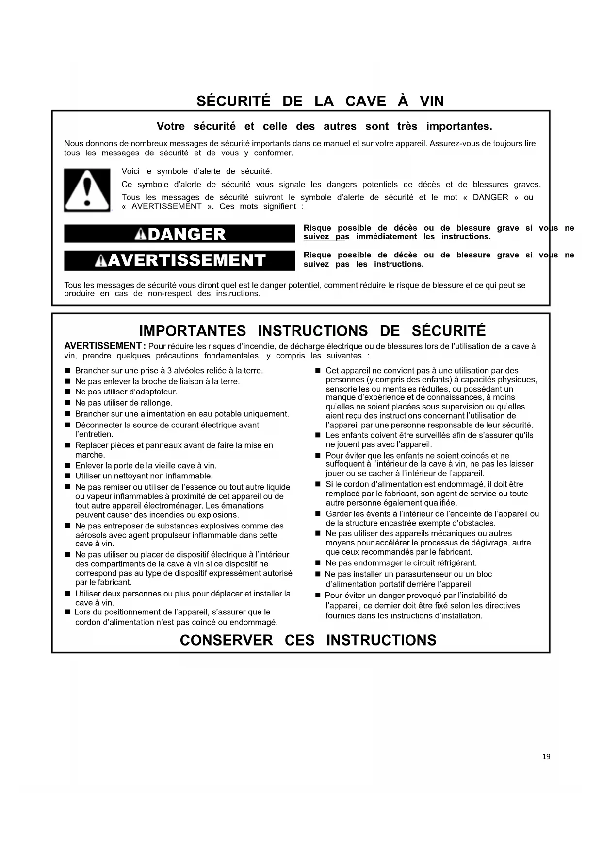 Sécurité de la cave à vin................. 19