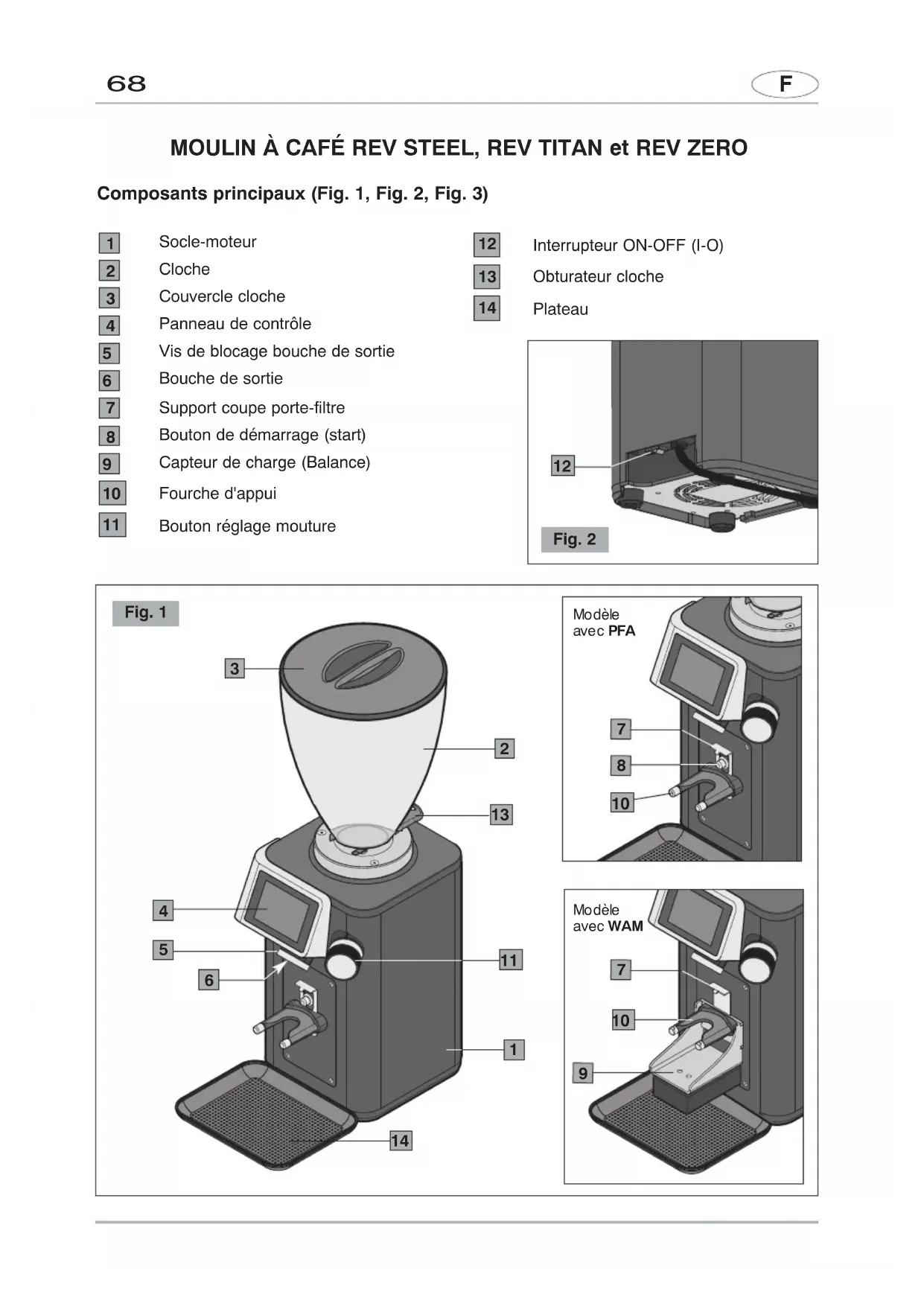 MOULIN À CAFÉ REV STEEL, REV TITAN et REV ZERO Composants principaux (Fig. 1, Fig. 2, Fig. 3) Fig. 2 Socle-moteur Cloche Couvercle cloche Panneau de contrôle Vis de blocage bouche de sortie Bouche de sortie Support coupe porte-filtre Bouton de démarrage (start) Capteur de charge (Balance) Fourche d'appui Bouton réglage mouture