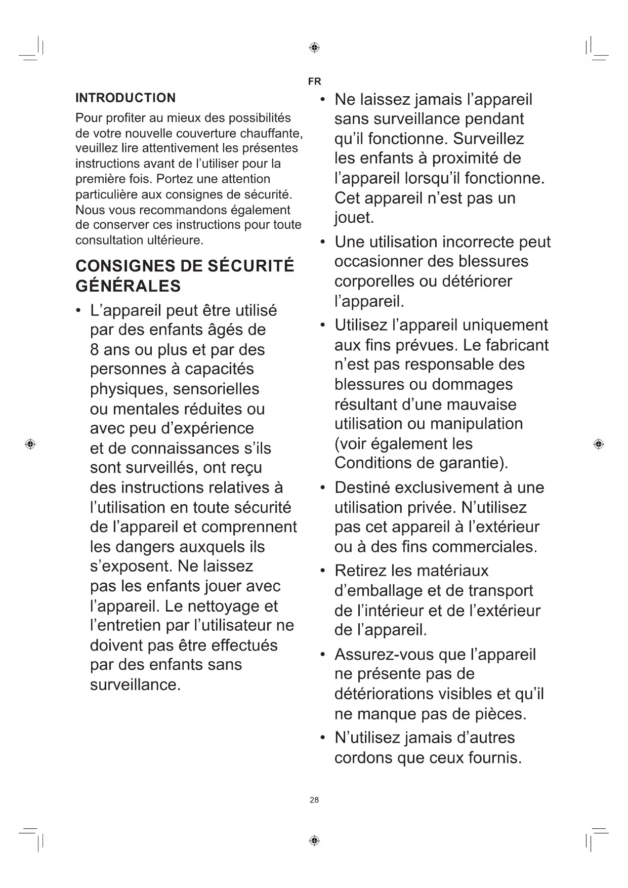 - L’appareil ne doit pas présenter de plis fortement marqués, ni être repassé, roulé, tordu, comprimé ou manipulé d’une manière susceptible d’endommager les fils chauffants intégrés.