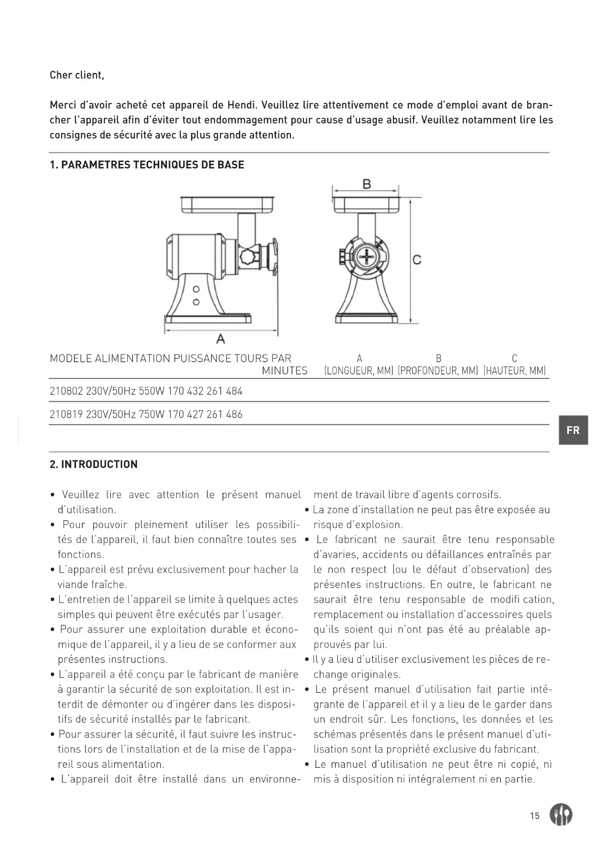 | Caractéristiques techniques | Hachoir Hendi 210802, puissance 300 W, capacité de hachage 1,5 kg/min, matériaux en acier inoxydable. |