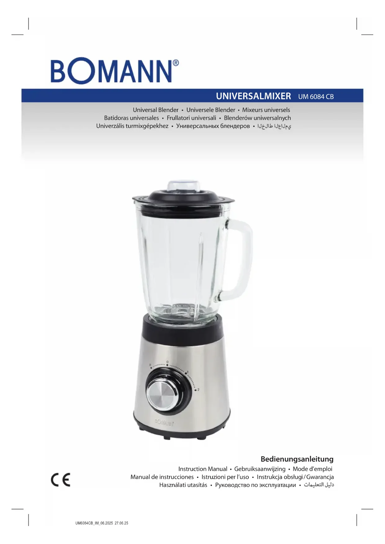 Dépannage Problème Cause possible Remède L’appareil ne fonctionne pas. L’appareil n’est pas alimenté en courant. Vérifiez la prise de courant avec un autre appareil. Insérez la fiche secteur correctement. Vérifiez le fusible de la maison. Mauvaise position de l’interrupteur. Vérifiez la position de l’interrupteur à paliers. Votre appareil est équipé d’un interrupteur de sécurité. Il empêche le moteur de se mettre en marche de manière intempestive. Vérifier que le bol du mixeur et son cou- vercle sont correctement en place. L’appareil est défectueux. Contactez notre service ou un spécialiste. Données techniques Modèle : .............................................................UM 6084 CB Alimentation électrique : ......................220 – 240 V~, 50 / 60 Hz Puissance absorbée : ...................................................700 W Puissance déclarée en mode veille : ..........................< 0,3 W Classe de protection : .......................................................... Quantité de remplissage : ..................................max. 1,5 litre Poids net : ..............................................................env. 2,8 kg Nous nous réservons le droit d’apporter des modications techniques ainsi que des modications de conception dans le cadre du développement continu de nos produits. Cet appareil a été testé conformément à toutes les direc- tives CE applicables et actuelles et a été construit selon les dernières réglementations en matière de sécurité. Élimination Signification du symbole « Poubelle » Protégez votre environnement, ne jetez pas vos appareils électriques avec les ordures ména- gères. Utilisez, pour l’élimination de vos appareils électriques, les bornes de collecte prévues à cet effet où vous pouvez vous débarrasser des appareils que vous n’utilisez plus. Vous contribuez ainsi à éviter les impacts potentiels dans l’environnement et sur la santé de chacun, causés par une mauvaise élimination de ces déchets. Vous contribuez aussi au recyclage sous toutes ses formes des appareils électriques et électroniques usagés. Vous trouverez toutes les informations sur les bornes d’élimination des appareils auprès de votre commune ou de l’administration de votre communauté. Votre revendeur et partenaire contractuel est également tenu de reprendre gratuitement l’ancien appareil.UM6084CB_IM_06.2025 27.06.25
