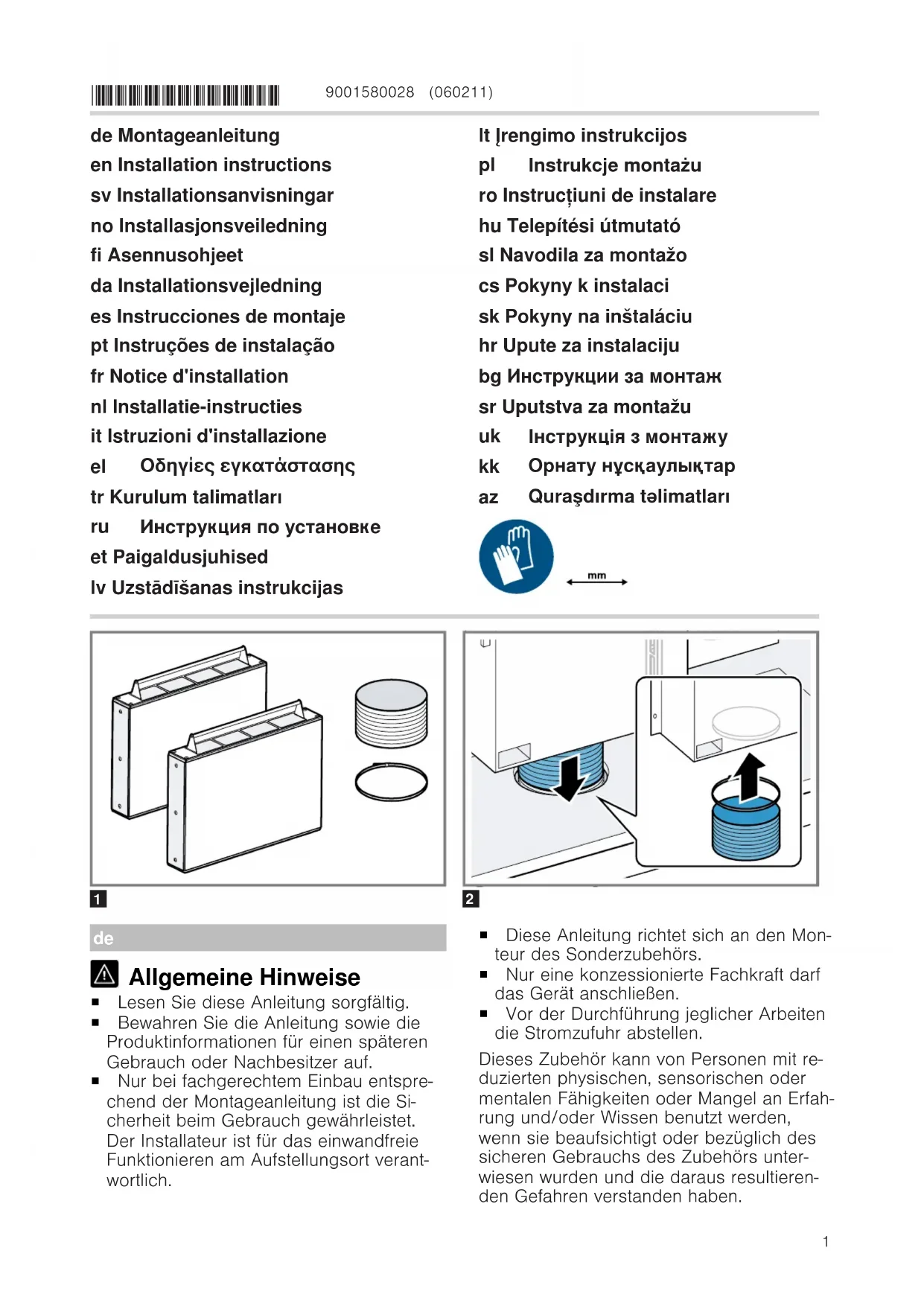 Indications générales ¡ Lisez attentivement cette notice. ¡ Conservez la notice ainsi que les informa- tions produit en vue d’une réutilisation ul- térieure ou pour un futur nouveau proprié- taire. ¡ La sécurité d'utilisation est garantie uni- quement en cas d'installation correcte et conforme aux instructions de montage. Le monteur est responsable du fonctionne- ment correct sur le lieu où l'appareil est installé. ¡ Cette notice s’adresse au monteur de l'accessoire spécial. ¡ Seul un spécialiste agréé est autorisé à brancher l'appareil. ¡ Avant toute intervention sur l'appareil, coupez l'alimentation électrique. Cet accessoire peut être utilisé par des per- sonnes aux capacités physiques, senso- rielles ou mentales réduites ou des per- sonnes inexpérimentées, à condition qu'elles soient surveillées ou qu'elles aient été informées de l'utilisation de l'accessoire et qu'elles comprennent les risques inhé- rents à son usage. Installation en toute sécurité Respectez les consignes de sécurité lors de l'instal- lation de l'accessoire spécial. AVERTISSEMENT‒Risque d'asphyxie! Les enfants risquent de s’envelopper dans les maté- riaux d’emballage ou de les mettre sur la tête et de s’étouffer.