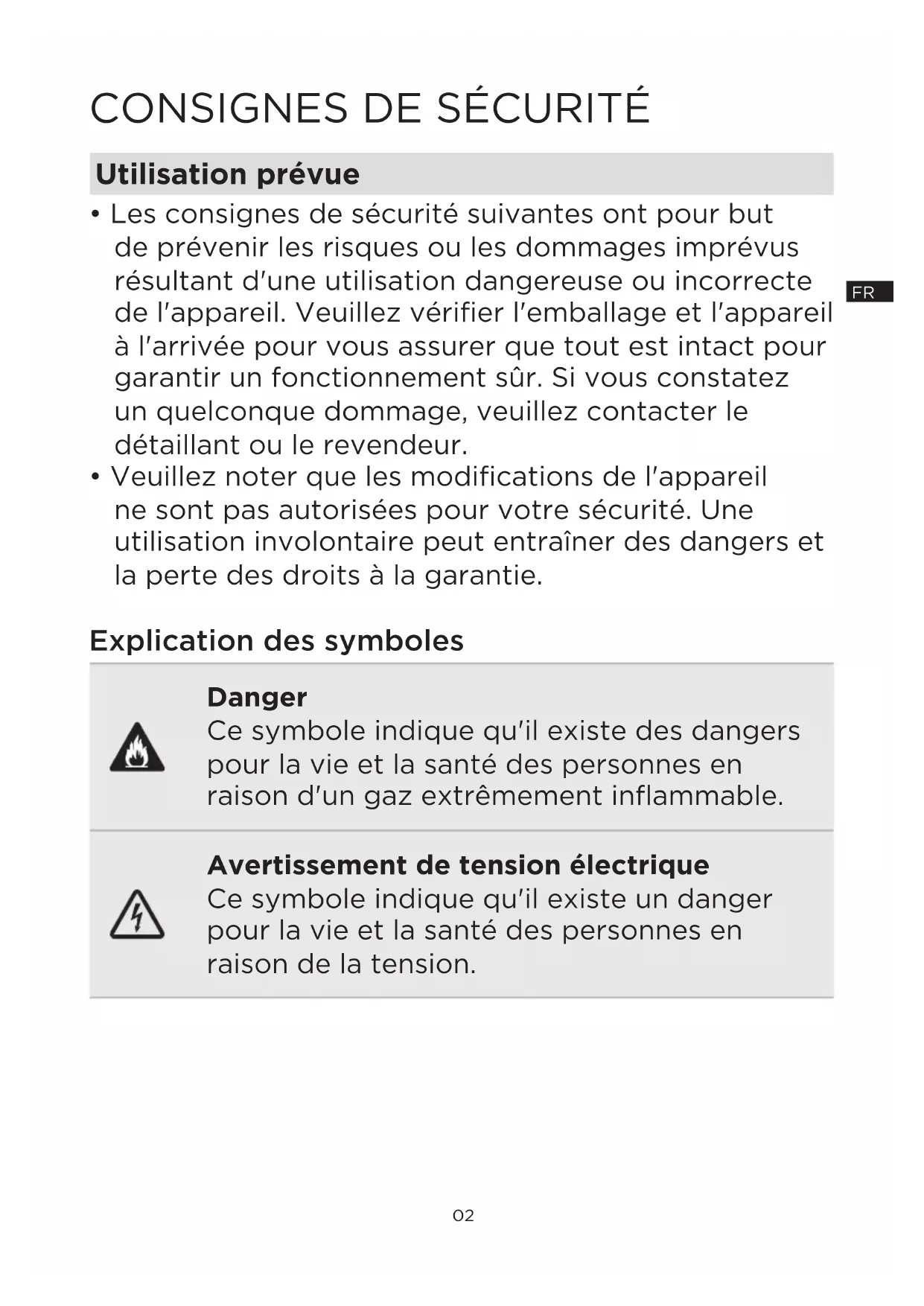 - Veuillez noter que les modifications de l'appareil ne sont pas autorisées pour votre sécurité. Une utilisation involontaire peut entraîner des dangers et la perte des droits à la garantie. Explication des symboles Danger Ce symbole indique qu'il existe des dangers pour la vie et la santé des personnes en raison d'un gaz extrêmement inflammable. Avertissement de tension électrique Ce symbole indique qu'il existe un danger pour la vie et la santé des personnes en raison de la tension. FR03 Avertissement Le mot de signalisation indique un danger avec un niveau de risque moyen qui, s'il n'est pas évité, peut entraîner la mort ou des blessures graves. Précaution Le mot de signalisation indique un danger avec un faible degré de risque qui, s'il n'est pas évité, peut entraîner des blessures mineures ou modérées. Attention Le mot de signalisation indique une information importante (par exemple, un dommage matériel), mais pas un danger. Respecter les instructions Ce symbole indique qu'un technicien de service ne doit utiliser et entretenir cet appareil que conformément aux instructions d'utilisation. Lisez attentivement ces instructions d'utilisation avant d'utiliser/de mettre en service l'unité et conservez- les à proximité immédiate du lieu d'installation ou de l'unité pour une utilisation ultérieure ! FR04