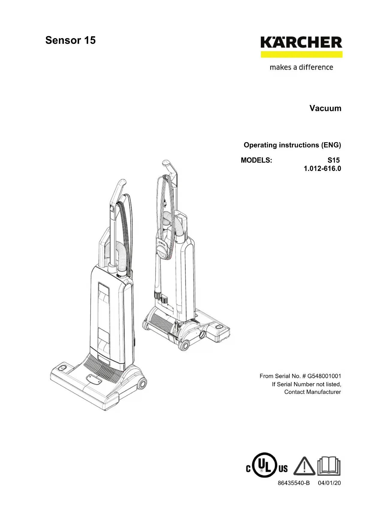 - 8.643-554.0 Manual - Karcher Sensor S1513 Mantenimiento Datos Technico U.S. Patents: 5,056,175 4,955,106 5,028,245 Motor de aspiración 1200 vatios Columna de agua 2300 mm (90 pulgadas) Flujo da aire 50 l/s Capacidad bolsa del polvo 5,3 liters Ancho operacional 308 mm (12 pulgadas) Motor del cepillo cinta dentada Velocidad del cepillo 2700 rpm ajuste al suelo mecánico Cable 12.2 m (40 pies) Peso 7.4 kg (16.2 libras) Supresión de radio EN 55014 Verf 242./91 8.643-554.0 Manual - Karcher Sensor S1586435540-B 04/01/20 Sensor 15 L'aspirateur Mode d'emploi (FRA) Modèle: S15 1.012-616.0 De série n ° # G548001001 Si le numéro de série ne figure pas, contacter le fabricant2 Modèle :Date d’achat :Numéro de série :Détaillant :Adresse :Numéro de téléphone :Représentant commercial: 8.643-554.0 Manual - Karcher Sensor S15 Étiquette de données de la machine Enregistrement de la garantie Merci d'avoir acheté un produit Kärcher North America. L'enregistrement de la garantie est facile et rapide. Votre enregistrement nous permettra de mieux vous servir tout au long de la durée de vie de votre produit. Pour enregistrer votre produit, consultez : Pour l'assistance client: 1-800-444-7654 http://warranty.karcherna.com3 Table des matières Étiquette de données de la machine p. 2
