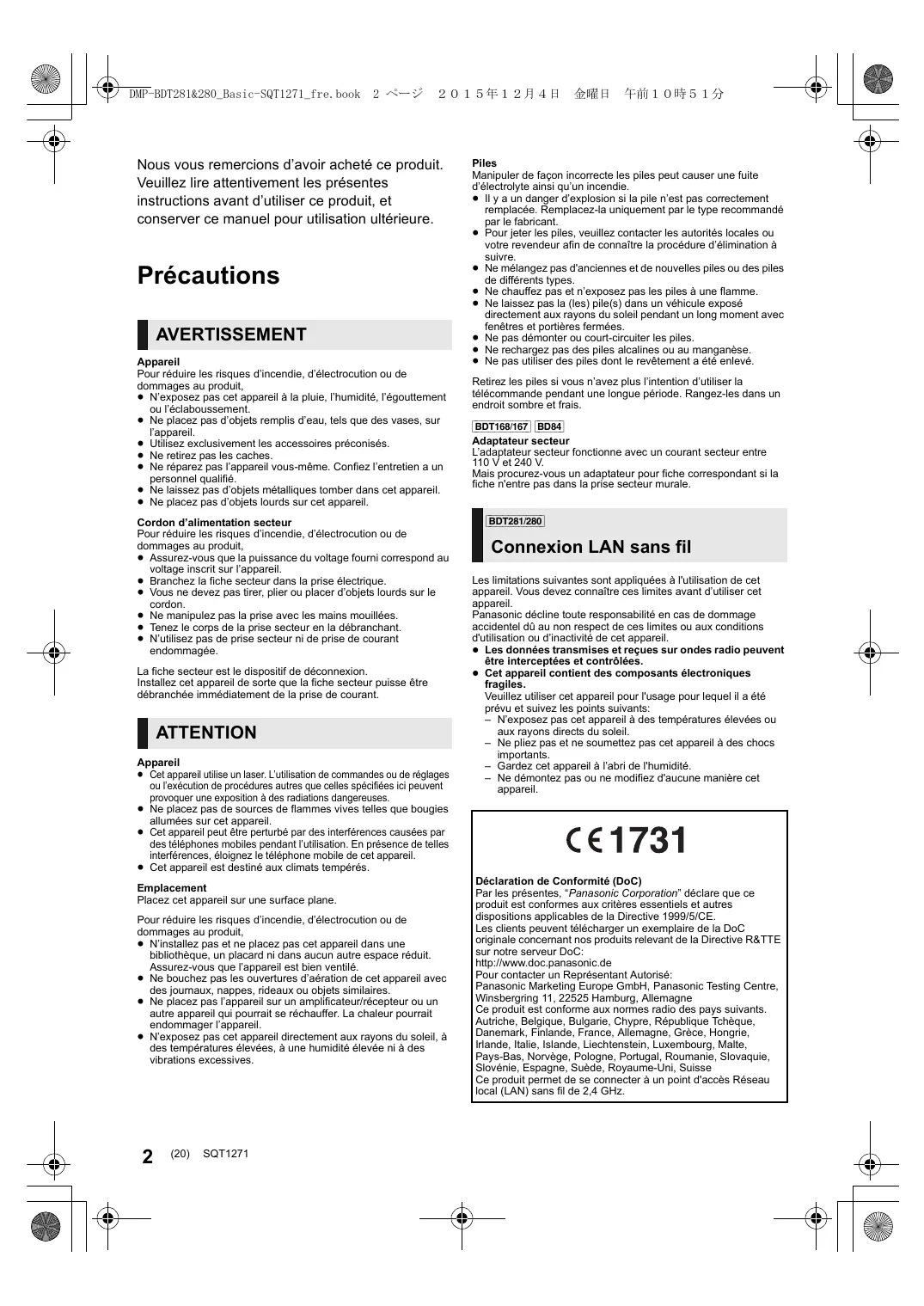 Piles Manipuler de façon incorrecte les piles peut causer une fuite d’électrolyte ainsi qu’un incendie. ≥ Il y a un danger d’explosion si la pile n’est pas correctement remplacée. Remplacez-la uniquement par le type recommandé par le fabricant. ≥ Pour jeter les piles, veuillez contacter les autorités locales ou votre revendeur afin de connaître la procédure d’élimination à suivre. ≥ Ne mélangez pas d'anciennes et de nouvelles piles ou des piles de différents types. ≥ Ne chauffez pas et n’exposez pas les piles à une flamme. ≥ Ne laissez pas la (les) pile(s) dans un véhicule exposé directement aux rayons du soleil pendant un long moment avec fenêtres et portières fermées. ≥ Ne pas démonter ou court-circuiter les piles. ≥ Ne rechargez pas des piles alcalines ou au manganèse. ≥ Ne pas utiliser des piles dont le revêtement a été enlevé. Retirez les piles si vous n’avez plus l’intention d’utiliser la télécommande pendant une longue période. Rangez-les dans un endroit sombre et frais. [BDT168/167] [BD84] Adaptateur secteur L’adaptateur secteur fonctionne avec un courant secteur entre 110 V et 240 V. Mais procurez-vous un adaptateur pour fiche correspondant si la fiche n'entre pas dans la prise secteur murale. [BDT281/280] Connexion LAN sans fil Les limitations suivantes sont appliquées à l'utilisation de cet appareil. Vous devez connaître ces limites avant d’utiliser cet appareil. Panasonic décline toute responsabilité en cas de dommage accidentel dû au non respect de ces limites ou aux conditions d'utilisation ou d’inactivité de cet appareil. ≥ Les données transmises et reçues sur ondes radio peuvent être interceptées et contrôlées. ≥ Cet appareil contient des composants électroniques fragiles. Veuillez utiliser cet appareil pour l'usage pour lequel il a été prévu et suivez les points suivants: – N’exposez pas cet appareil à des températures élevées ou aux rayons directs du soleil. – Ne pliez pas et ne soumettez pas cet appareil à des chocs importants. – Gardez cet appareil à l’abri de l'humidité. – Ne démontez pas ou ne modifiez d'aucune manière cet appareil. Déclaration de Conformité (DoC) Par les présentes, “Panasonic Corporation” déclare que ce produit est conformes aux critères essentiels et autres dispositions applicables de la Directive 1999/5/CE. Les clients peuvent télécharger un exemplaire de la DoC originale concernant nos produits relevant de la Directive R&TTE sur notre serveur DoC: http://www.doc.panasonic.de Pour contacter un Représentant Autorisé: Panasonic Marketing Europe GmbH, Panasonic Testing Centre, Winsbergring 11, 22525 Hamburg, Allemagne Ce produit est conforme aux normes radio des pays suivants. Autriche, Belgique, Bulgarie, Chypre, République Tchèque, Danemark, Finlande, France, Allemagne, Grèce, Hongrie, Irlande, Italie, Islande, Liechtenstein, Luxembourg, Malte, Pays-Bas, Norvège, Pologne, Portugal, Roumanie, Slovaquie, Slovénie, Espagne, Suède, Royaume-Uni, Suisse Ce produit permet de se connecter à un point d'accès Réseau local (LAN) sans fil de 2,4 GHz. En cas d’élimination ou de cession de cet appareil Cet appareil peut conserver les informations de réglage d’utilisateur. Si vous vous débarrassez de cet appareil en le jetant ou en le cédant, suivez la procédure du retour de tous les réglages de préréglage en usine pour effacer les réglages d’utilisateur. 1 Allumez l'appareil. 2 Appuyez simultanément sur [OK], la touche jaune et la touche bleue de la télécommande pendant plus de 5 secondes. – La LED POWER commence à clignoter et “00 RET” s'affiche à l'écran. 3 Appuyez plusieurs fois sur [1] (droite) de la télécommande jusqu'à ce que “08 FIN” s'affiche à l'écran. 4 Appuyez sur [OK] pendant au moins 5 secondes. ≥ L’historique de l’exploitation peut être enregistré dans la mémoire de cet appareil. L’élimination des équipements et des batteries usagés Applicable uniquement dans les pays membres de l’Union européenne et les pays disposant de systèmes de recyclage Français Apposé sur le produit lui-même, sur son emballage, ou figurant dans la documentation qui l’accompagne, ce pictogramme indique que les piles, appareils électriques et électroniques usagés, doivent être séparées des ordures ménagères. Afin de permettre le traitement, la valorisation et le recyclage adéquats des piles et des appareils usagés, veuillez les porter à l’un des points de collecte prévus, conformément à la législation nationale en vigueur. En les éliminant conformément à la réglementation en vigueur, vous contribuez à éviter le gaspillage de ressources précieuses ainsi qu’à protéger la santé humaine et l’environnement. Pour de plus amples renseignements sur la collecte et le recyclage, veuillez vous renseigner auprès des collectivités locales. Le non-respect de la réglementation relative à l’élimination des déchets est passible d’une peine d’amende. Note relative au pictogramme à apposer sur les piles (pictogramme du bas): Si ce pictogramme est combiné avec un symbole chimique, il répond également aux exigences posées par la Directive relative au produit chimique concerné. SQT1271 (21)