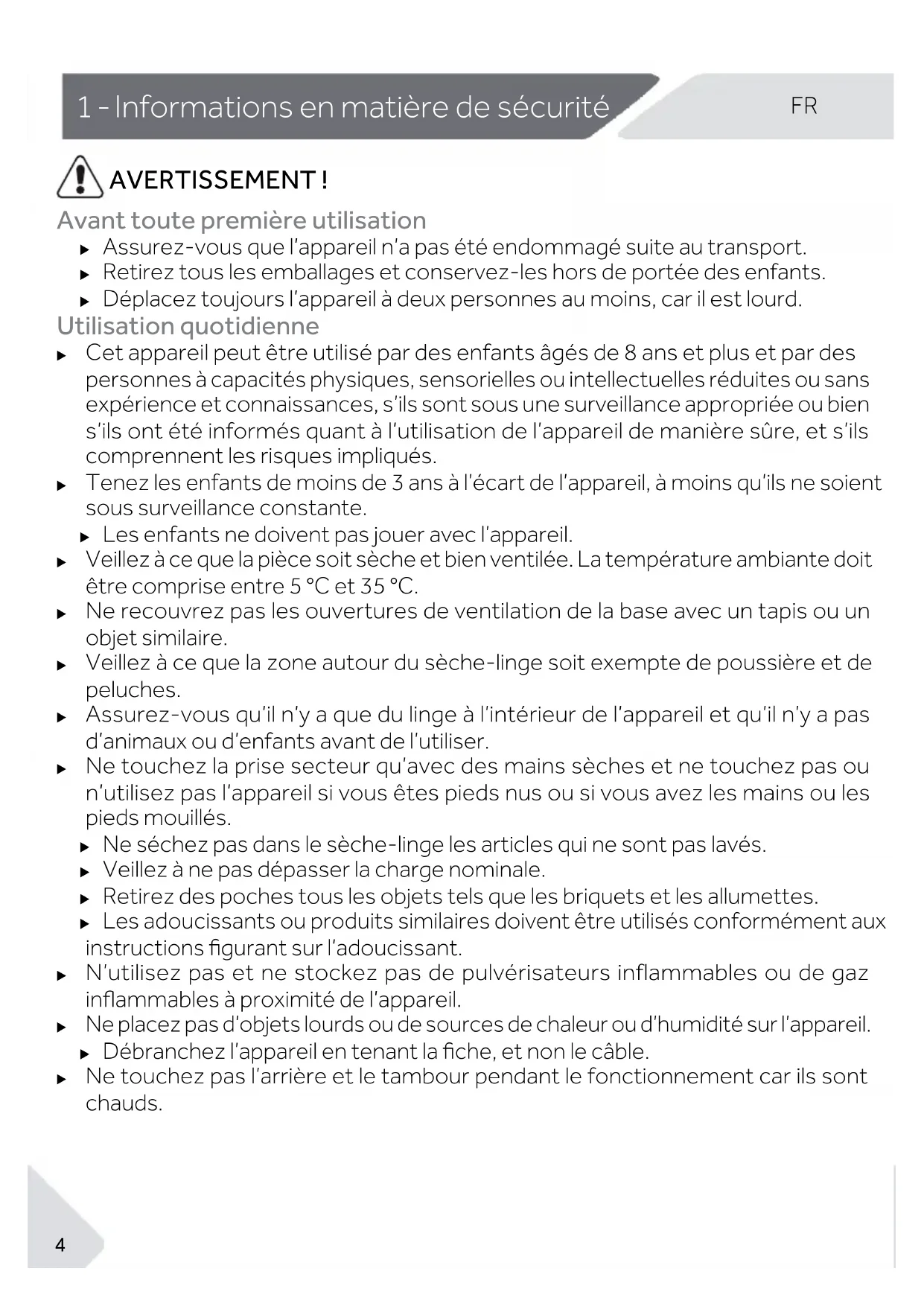 Ne touchez pas l’arrière et le tambour pendant le fonctionnement car ils sont chauds. 1 - Informations en matière de sécuritéFR