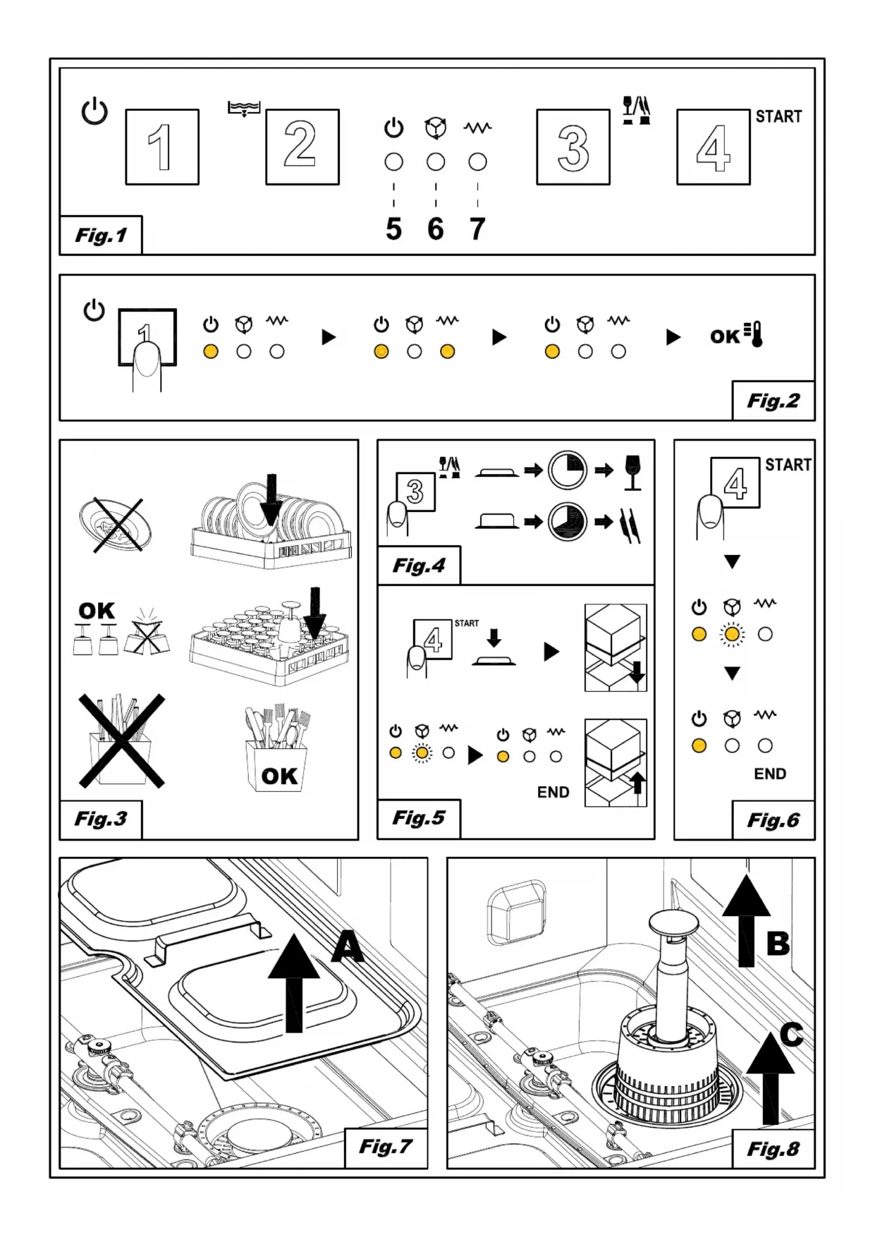 Sélectionner le cycle de lavage adapté au type de vaisselle SÉLECTION PROGRAMME (3) ; le cycle le plus rapide ( Fig.4 )est activé en lorsque le bouton est pressé. Appuyer sur le bouton START (3) pour activer le départ automatique (Fig.6). Abaisser le capot, le cycle commence immédiatement et la LED CYCLE EN COURS (5) commence à clignoter. À la fin du cycle, la LED CYCLE EN COURS (5) s'éteint. Les cycles suivants s'activent simplement en abaissant le capot. Pour un séchage rapide de la vaisselle, enlever immédiatement le panier à la fin du cycle. Pour arrêter le cycle de lavage sans en attendre la fin, appuyer sur la START (3).