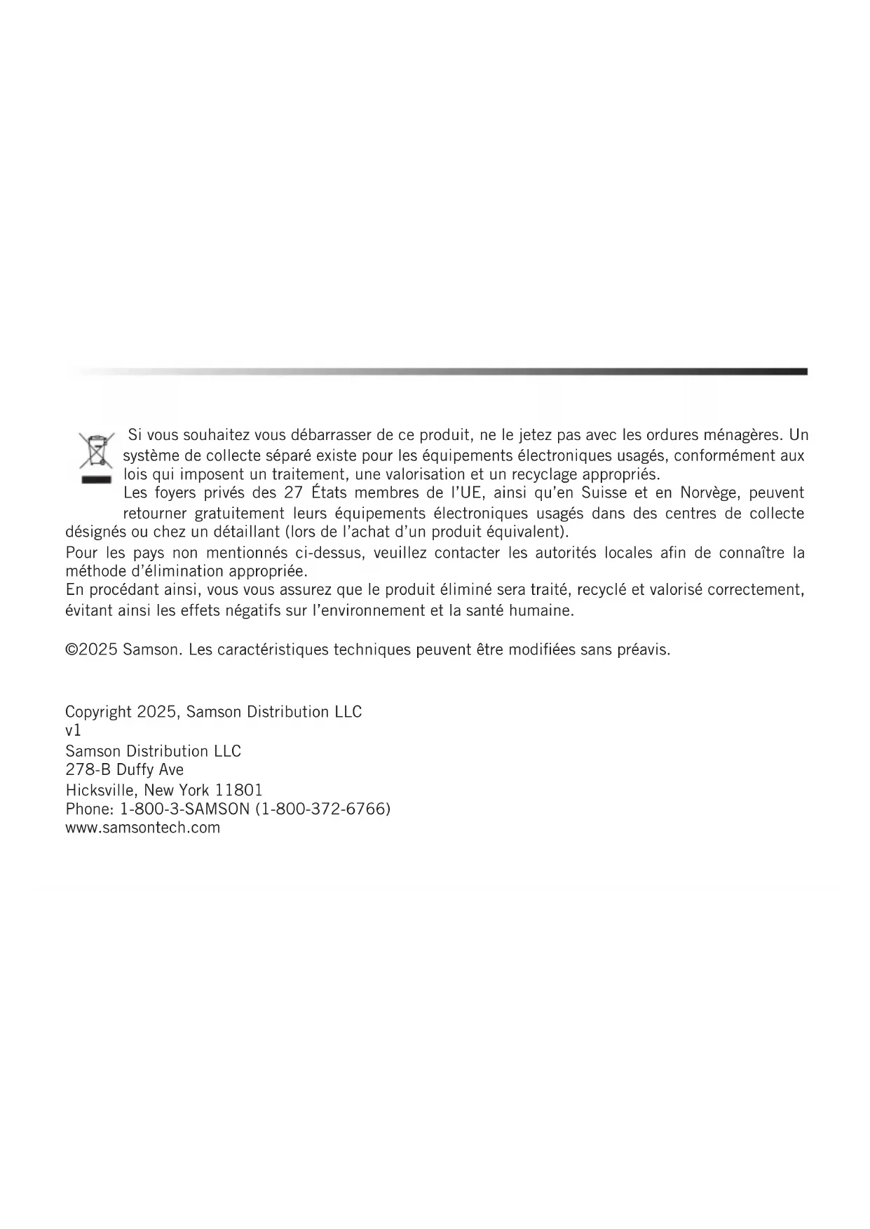 Samson Distribution LLC 278-B Duffy Ave Hicksville, New York 11801 Phone: 1-800-3-SAMSON (1-800-372-6766) www.samsontech.com Si vous souhaitez vous débarrasser de ce produit, ne le jetez pas avec les ordures ménagères. Un système de collecte séparé existe pour les équipements électroniques usagés, conformément aux lois qui imposent un traitement, une valorisation et un recyclage appropriés. Les foyers privés des 27 États membres de l’UE, ainsi qu’en Suisse et en Norvège, peuvent retourner gratuitement leurs équipements électroniques usagés dans des centres de collecte désignés ou chez un détaillant (lors de l’achat d’un produit équivalent). Pour les pays non mentionnés ci-dessus, veuillez contacter les autorités locales afin de connaître la méthode d’élimination appropriée. En procédant ainsi, vous vous assurez que le produit éliminé sera traité, recyclé et valorisé correctement, évitant ainsi les effets négatifs sur l’environnement et la santé humaine. ©2025 Samson. Les caractéristiques techniques peuvent être modifiées sans préavis.EN FR DE ES IT Introduction Idéal pour les musiciens souhaitant réamplifier des instruments enregistrés, le Samson ReTrack est une boîte de réamplification passive compacte équipée d’une entrée combo XLR/jack 6,35 mm et d’une sortie instrument niveau jack 6,35 mm pour ampli. Le ReTrack permet d’envoyer un signal audio enregistré depuis une guitare, une interface audio ou une console vers un ampli pour réamplification et ajustement de tonalité. Conçu pour être polyvalent, le ReTrack comprend un réglage de volume rotatif, un interrupteur de levée de masse, et un sélecteur pour passer d’une entrée ligne standard à une sortie casque stéréo – idéal pour les interfaces USB modernes, les ordinateurs portables et les équipements portables. Son châssis robuste en acier 14-gauge de la série S-Max en fait un outil parfait pour le studio comme pour la scène. AVIS IMPORTANT ! Le Samson ReTrack est un appareil passif de réamplification spécifiquement conçu pour être utilisé avec des amplificateurs disposant d’une mise à la terre conforme aux normes de sécurité électrique reconnues (UL, CSA, etc.). En raison de la variabilité des équipements et pédales connectés, l’utilisation du ReTrack peut comporter un risque de choc électrique. L’utilisateur assume l’entière responsabilité des conséquences de son utilisation, celles-ci échappant au contrôle du fabricant. En utilisant cet appareil, vous confirmez que vous comprenez et acceptez l’entière responsabilité de son utilisation en toute sécurité. Si vous n’êtes pas sûr à 100 % de la manière de le connecter ou de l’utiliser, veuillez consulter un technicien qualifié avant toute utilisation.L’entrée principale du ReTrack est un connecteur combo XLR/jack TRS 6,35 mm, acceptant les signaux symétriques ou asymétriques provenant d’interfaces audio ou de consoles. Le sélecteur d’entrée permet de choisir entre une sortie ligne standard ou un signal casque stéréo – idéal si votre interface audio portable ne dispose pas de sorties ligne dédiées. Cette flexibilité vous permet de réamplifier des signaux sans devoir débrancher votre système de monitoring. La sortie instrument jack 6,35 mm du ReTrack se connecte directement à un ampli, une pédale ou tout autre équipement. Le potentiomètre de volume intégré permet un réglage précis du niveau de réamplification, tandis que l’interrupteur de levée de masse aide à éliminer les ronflements ou interférences causés par des boucles de masse. Vous bénéficiez ainsi d’un signal clair entre votre station audio numérique (DAW) et votre ampli. Faisant partie de la série S-Max de Samson, le ReTrack est logé dans un robuste châssis en acier 14-gauge, conçu pour résister aux rigueurs des sessions en studio et des performances scéniques. Tous les composants et interrupteurs internes sont protégés par un boîtier conçu pour durer, quelle que soit la situation. Polyvalence intégrée Conçu pour le studio Solidité S-MaxEN FR DE ES IT Éléments de commande