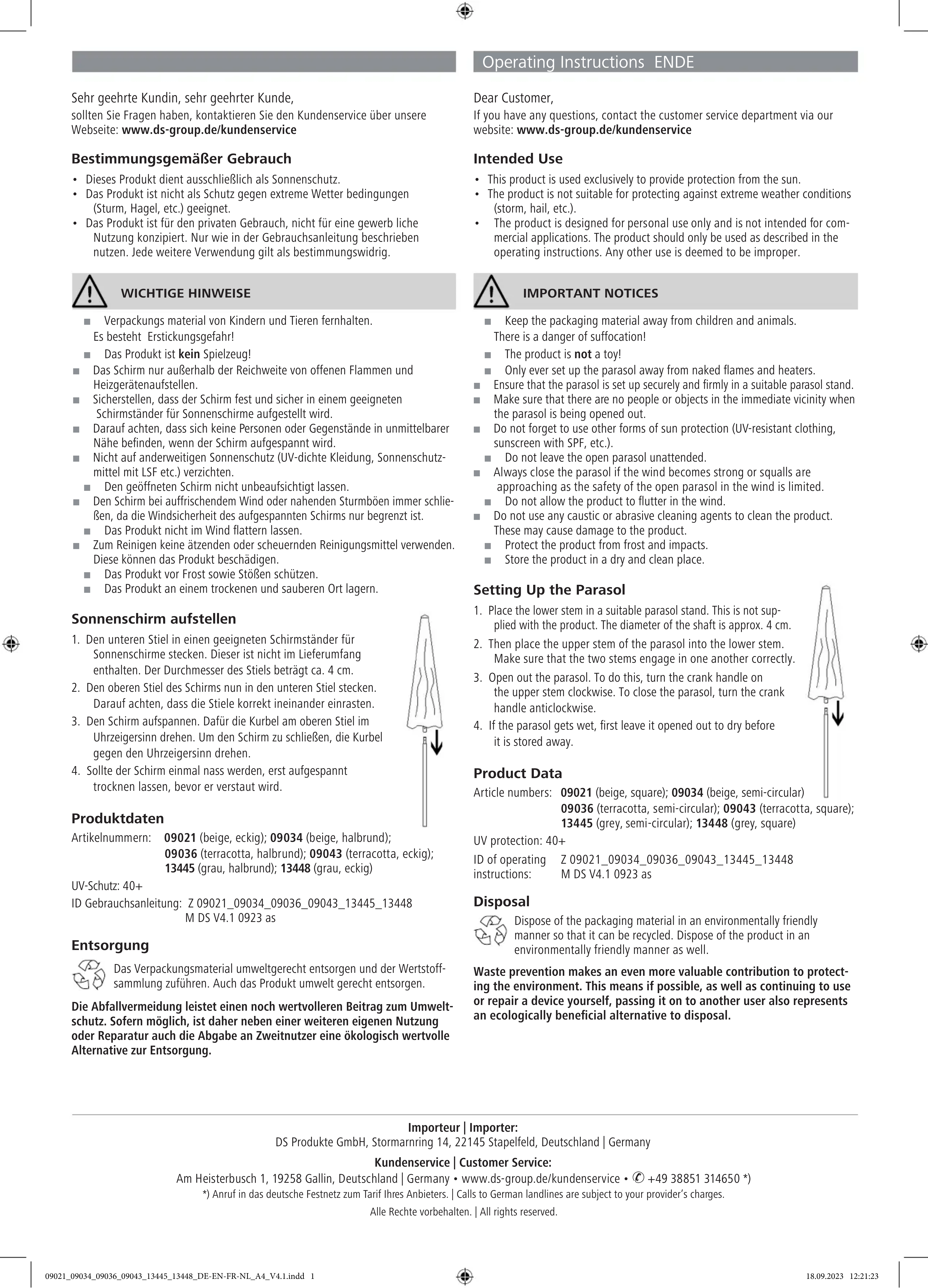 déployé avant de le ranger. Données du produit Références articles: 09021 (beige, carré); 09034 (beige, semi-circulaire); 09036 (terre cuite, semi-circulaire); 09043 (terre cuite, carré); 13445 (gris, semi-circulaire); 13448 (gris, carré) Protection anti-UV: 40+ Identifiant mode d’emploi: Z 09021_09034_09036_09043_13445_13448 M DS V4.1 0923 as Mise au rebut Se débarrasser des matériaux d’emballage dans le respect de l’environnement en les déposant à un point de collecte prévu à cet effet. Également éliminer le produit dans le respect de l’environnement. La prévention des déchets est une contribution encore plus précieuse en faveur de la protection de l’environnement. La cession à un autre utilisateur, lorsqu’elle est possible, représente donc aussi une précieuse alternative sur le plan écolo- gique par rapport au propre réemploi ou à la réparation. Beste klant, Mocht u vragen hebben, neem dan contact op met de klantenservice via onze website: www.ds-group.de/kundenservice Doelmatig gebruik