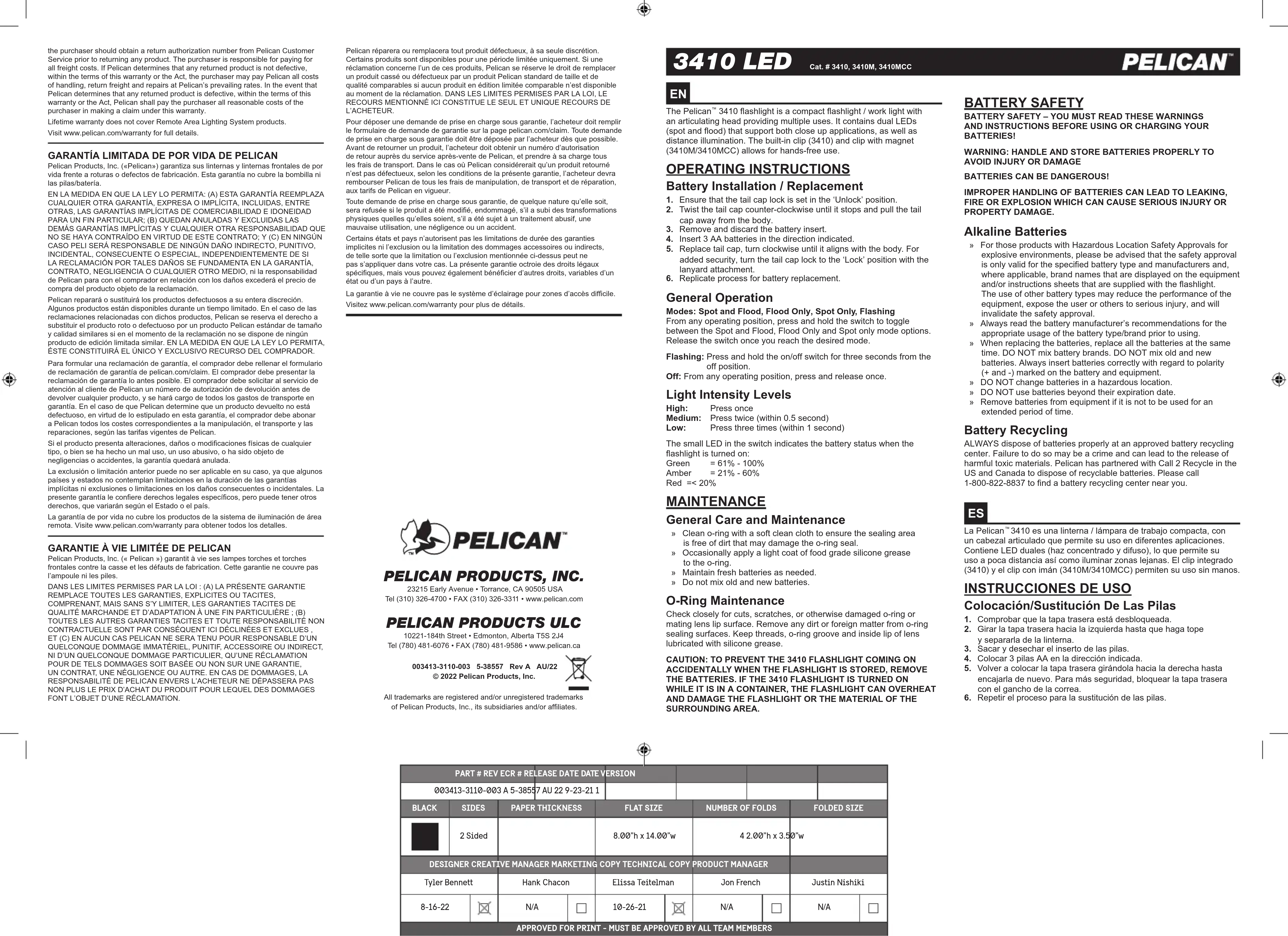 CORRECTEMENT POUR ÉVITER TOUT RISQUE DE BLESSURE OU DE DOMMAGE LES PILES PEUVENT ÊTRE DANGEREUSES! UNE MAUVAISE MANIPULATION DES PILES PEUT ENTRAINER UNE FUITE, UN INCENDIE OU UNE EXPLOSION POUVANT CAUSER DES BLESSURES GRAVES OU DES DOMMAGES MATÉRIELS. Piles Alcalines » Pour ces produits soumis aux Approbations de sécurité des emplacements dangereux pour les environnements explosifs, veuillez noter que l’approbation de sécurité est valide uniquement pour le type de pile et les fabricants spéciés, et le cas échéant, les noms de marque afchés sur l’équipement et/ou les ches d’instructions fournies avec la lampe torche. L’utilisation d’autres types de piles peut réduire les performances de l’équipement, exposer l’utilisateur ou d’autres personnes à des blessures graves et invalidera l’approbation de sécurité. » Lisez toujours les recommandations du fabricant de la pile pour connaître l’utilisation appropriée du type/de la marque de la pile avant utilisation. » Lors du remplacement des piles, remplacez toutes les piles au même moment. ÉVITEZ de mélanger différentes marques de piles. ÉVITEZ de mélanger d’anciennes piles avec des piles neuves. Insérez toujours les piles correctement en observant la polarité (+ et -) indiquée sur la pile et l’équipement. » ÉVITEZ de changer les piles dans un emplacement dangereux. » ÉVITEZ d’utiliser les piles au-delà de leur date d’expiration. » Retirez les piles de l’équipement en cas de non-utilisation pendant une période prolongée. Recyclage Des Piles Éliminez TOUJOURS les piles correctement dans un centre de recyclage de piles approuvés. Le non-respect de cette instruction peut constituer un crime est entrainer la libération de matières toxiques nocives. Pelican a formé un partenariat avec Call 2 Recycle aux États- Unis et au Canada pour l’élimination des piles recyclables. Appelez le 1-800-822-8837 pour trouver le centre de recyclage de piles le plus proche de chez vous.