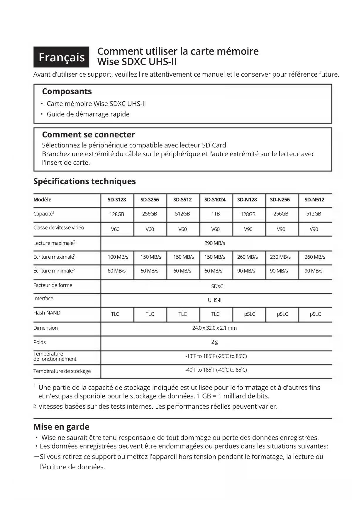 2 g -13˚F to 185˚F (-25˚C to 85˚C) -40˚F to 185˚F (-40˚C to 85˚C) SD-S128 TLC SD-S256 TLC SD-S512 TLC SD-N128 pSLC SD-N256 pSLC SD-N512 pSLCFrançais Comment utiliser la carte mémoire Wise SDXC UHS-II Avant d’utiliser ce support, veuillez lire attentivement ce manuel et le conserver pour référence future. Composants ・ Carte mémoire Wise SDXC UHS-II ・ Guide de démarrage rapide Comment se connecter Sélectionnez le périphérique compatible avec lecteur SD Card. Branchez une extrémité du câble sur le périphérique et l’autre extrémité sur le lecteur avec l'insert de carte. Spécifications techniques Modèle Capacité
