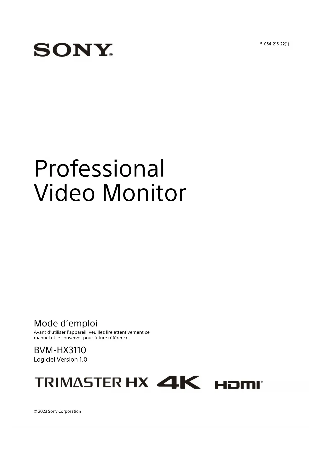 - 5-054-215-22(1) Professional Video Monitor Mode d’emploi Avant d’utiliser l’appareil, veuillez lire attentivement ce manuel et le conserver pour future référence. BVM-HX3110 Logiciel Version 1.0 © 2023 Sony Corporation2 Table des matières Précautions d’emploi p. 3