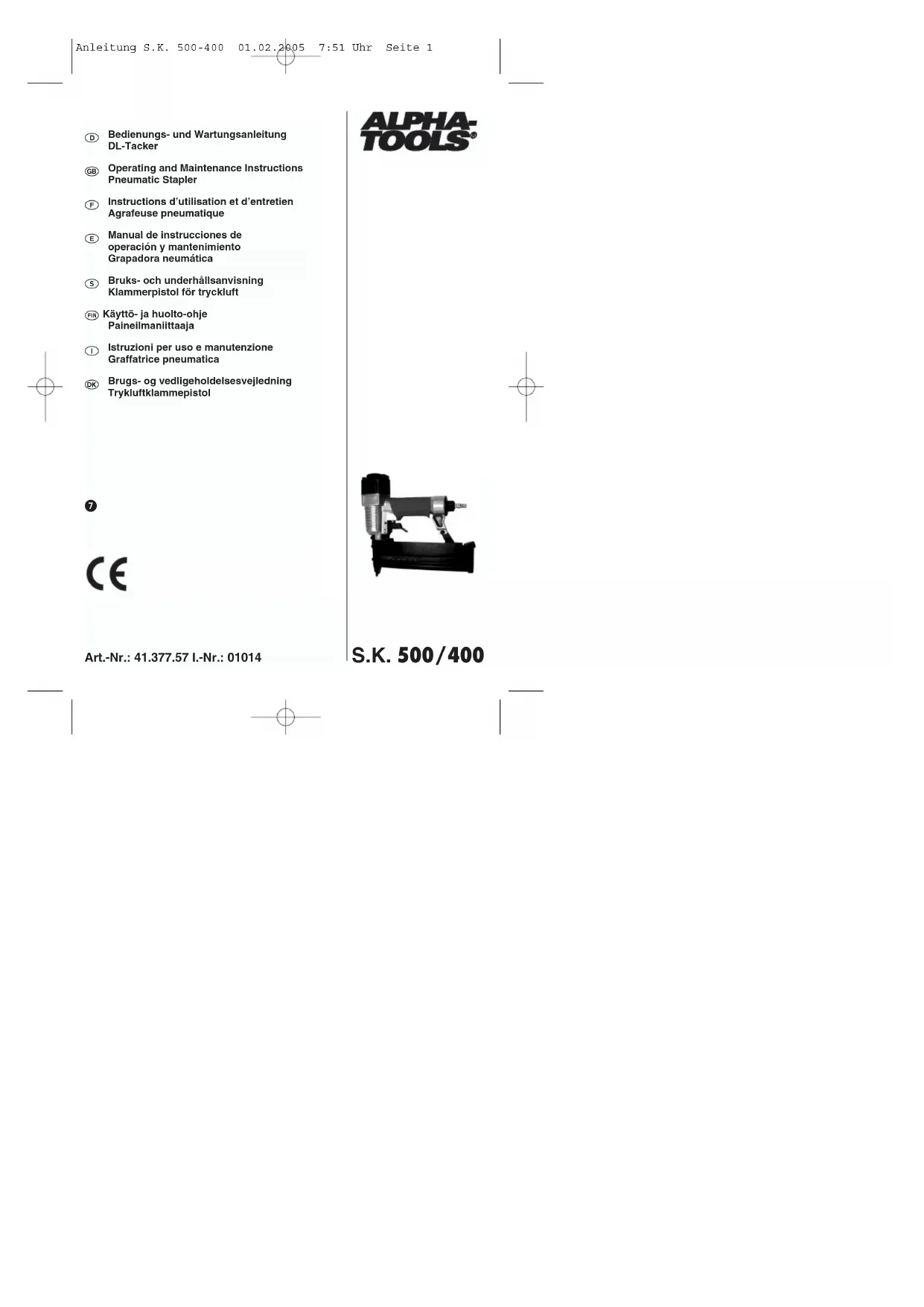 Téléchargez la notice de votre Agrafeuse pneumatique au format PDF gratuitement ! Retrouvez votre notice S.K. 500400 - Alpha Tools et reprennez votre appareil électronique en main. Sur cette page sont publiés tous les documents nécessaires à l'utilisation de votre appareil S.K. 500400 de la marque Alpha Tools.
