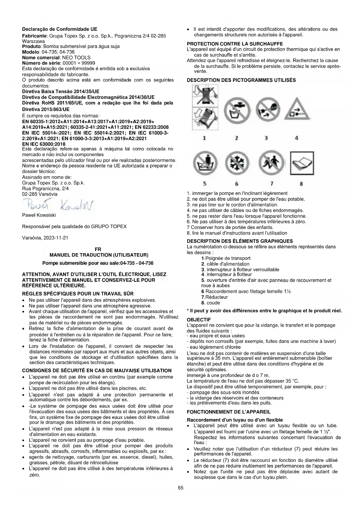 Les piles / batteries rechargeables ne doivent pas être jetées dans les ordures ménagères, ni dans le feu ou dans l'eau. Les piles endommagées ou usagées doivent être recyclées conformément à la directive en vigueur sur l'élimination des piles et des accumulateurs. "Grupa Topex Spółka z ograniczoną odpowiedzialnością" Spółka komandytowa, dont le siège social est situé à Varsovie, ul. Pograniczna 2/4 (ci-après : "Grupa Topex") informe que tous les droits d'auteur sur le contenu de ce manuel (ci-après : "Manuel"), y compris, entre autres. Son texte, ses photographies, ses diagrammes, ses dessins, ainsi que sa composition, appartiennent exclusivement à Grupa Topex et font l'objet d'une protection juridique en vertu de la loi du 4 février 1994 sur le droit d'auteur et les droits connexes (Journal officiel 2006 n° 90 Poz. 631, telle que modifiée). La copie, le traitement, la publication, la modification à des fins commerciales de l'ensemble du manuel et de ses différents éléments, sans l'accord écrit de Grupa Topex, sont strictement interdits et peuvent entraîner des responsabilités civiles et pénales. Déclaration de conformité de l'UE Fabricant : Grupa Topex Sp. z o.o. Sp.k., Pograniczna 2/4 02-285 Warszawa Produit : Pompe submersible pour eau sale Modèle : 04-735 ; 04-736 Nom commercial : NEO TOOLS Numéro de série : 00001 ÷ 9999968 Cette déclaration de conformité est délivrée sous la seule responsabilité du fabricant. Le produit décrit ci-dessus est conforme aux documents suivants : Directive basse tension 2014/35/EU Directive sur la compatibilité électromagnétique 2014/30/EU Directive RoHS 2011/65/EU modifiée par la directive 2015/863/EU Et répond aux exigences des normes : EN 60335-1:2012+A11:2014+A13:2017+A1:2019+A2:2019+ A14:2019+A15:2021 ; 60335-2-41:2021+A11:2021 ; EN 62233:2008 EN IEC 55014-:2021 ; EN IEC 55014-2:2021 ; EN IEC 61000-3- 2:2019+A1:2021 ; EN 61000-3-3:2013+A1:2019+A2:2021 EN IEC 63000:2018 Cette déclaration ne concerne que la machine telle qu'elle est mise sur le marché et n'inclut pas les composants ajoutés par l'utilisateur final ou effectués par lui ultérieurement. Nom et adresse de la personne résidant dans l'UE autorisée à préparer le dossier technique : Signé au nom de : Grupa Topex Sp. z o.o. Sp.k. 2/4 rue Pograniczna 02-285 Varsovie Paweł Kowalski GROUPE TOPEX Responsable de la qualité Varsovie, 2023-11-21