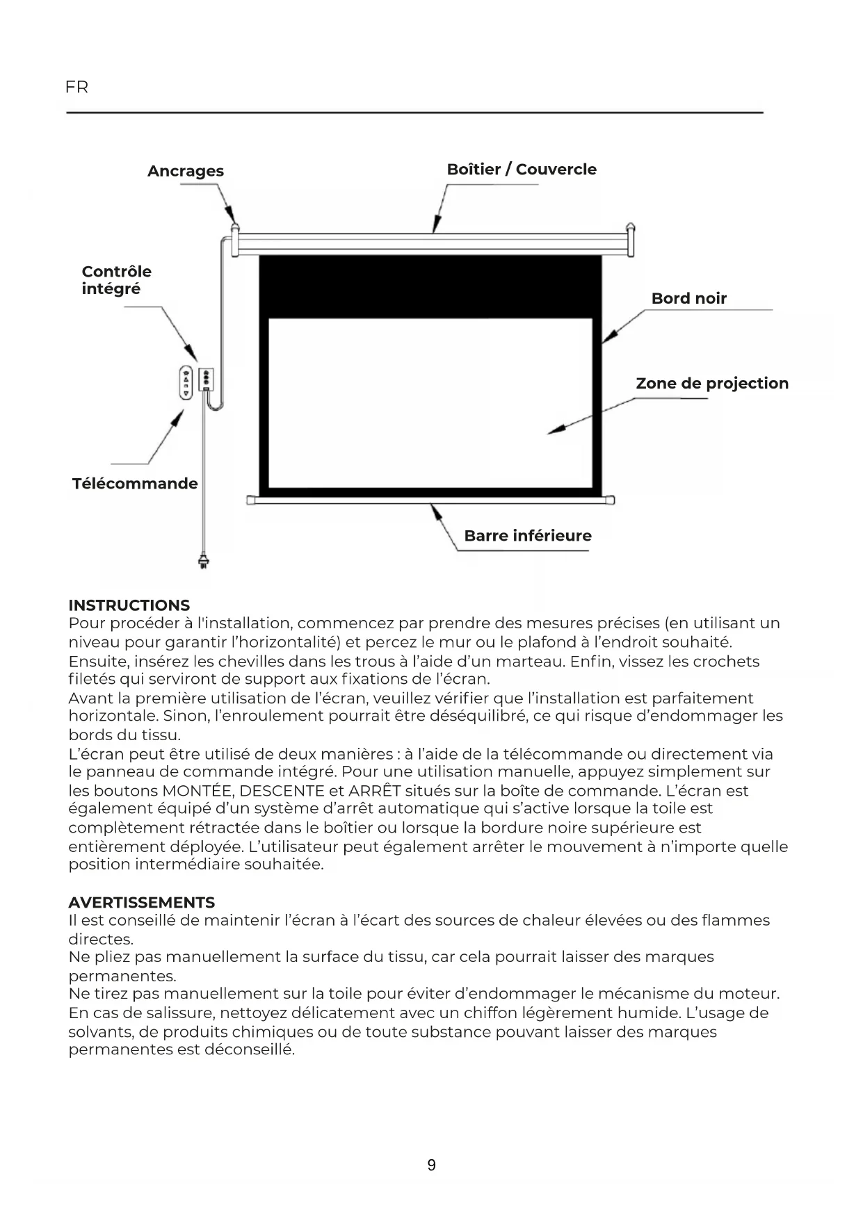 CATEGORY Prixton Electric projection screen Image CINEMA MAX MATCHING Keep pressing Stop2 button of controller for 5 seconds,after hearing “du-du-”,controller is in matching status. Press any button of any handset that you want to match with this controller,after hearing"du---",this handset is matched with this controller.Then the controller is out of set up status.(If no other operations in 8 seconds,then the controller is out of set up status.) Keep pressing Stop2 button of controller for 15 seconds,after hearing "du-du-du-",the learned content in the remote control is deleted at the same time. TROUBLE SHOOTING Controller no reaction - Please check power Controller working handset not working - Refer matching step to copy signal of handset Only go up or go down - Check connection according to instruction of screen The control distance is shorten or available - Change the battery(23A 12V) Motor not working - Check connection of wires 8FR INSTRUCTIONS Pour procéder à l'installation, commencez par prendre des mesures précises (en utilisant un niveau pour garantir l’horizontalité) et percez le mur ou le plafond à l’endroit souhaité. Ensuite, insérez les chevilles dans les trous à l’aide d’un marteau. Enfin, vissez les crochets filetés qui serviront de support aux fixations de l’écran. Avant la première utilisation de l’écran, veuillez vérifier que l’installation est parfaitement horizontale. Sinon, l’enroulement pourrait être déséquilibré, ce qui risque d’endommager les bords du tissu. L’écran peut être utilisé de deux manières : à l’aide de la télécommande ou directement via le panneau de commande intégré. Pour une utilisation manuelle, appuyez simplement sur les boutons MONTÉE, DESCENTE et ARRÊT situés sur la boîte de commande. L’écran est également équipé d’un système d’arrêt automatique qui s’active lorsque la toile est complètement rétractée dans le boîtier ou lorsque la bordure noire supérieure est entièrement déployée. L’utilisateur peut également arrêter le mouvement à n’importe quelle position intermédiaire souhaitée. AVERTISSEMENTS Il est conseillé de maintenir l’écran à l’écart des sources de chaleur élevées ou des flammes directes. Ne pliez pas manuellement la surface du tissu, car cela pourrait laisser des marques permanentes. Ne tirez pas manuellement sur la toile pour éviter d’endommager le mécanisme du moteur. En cas de salissure, nettoyez délicatement avec un chiffon légèrement humide. L’usage de solvants, de produits chimiques ou de toute substance pouvant laisser des marques permanentes est déconseillé. Ancrages Boîtier / Couvercle Bord noir Zone de projection Barre inférieure Contrôle intégré Télécommande 9Contrôleur à distance pour électromoteur Installe le schéma de câblage Schéma de câblage Alternateur Fil de montée : Marron Fil du milieu : Bleu Fil de descente : Noir Fil de terre : Jaune-Vert