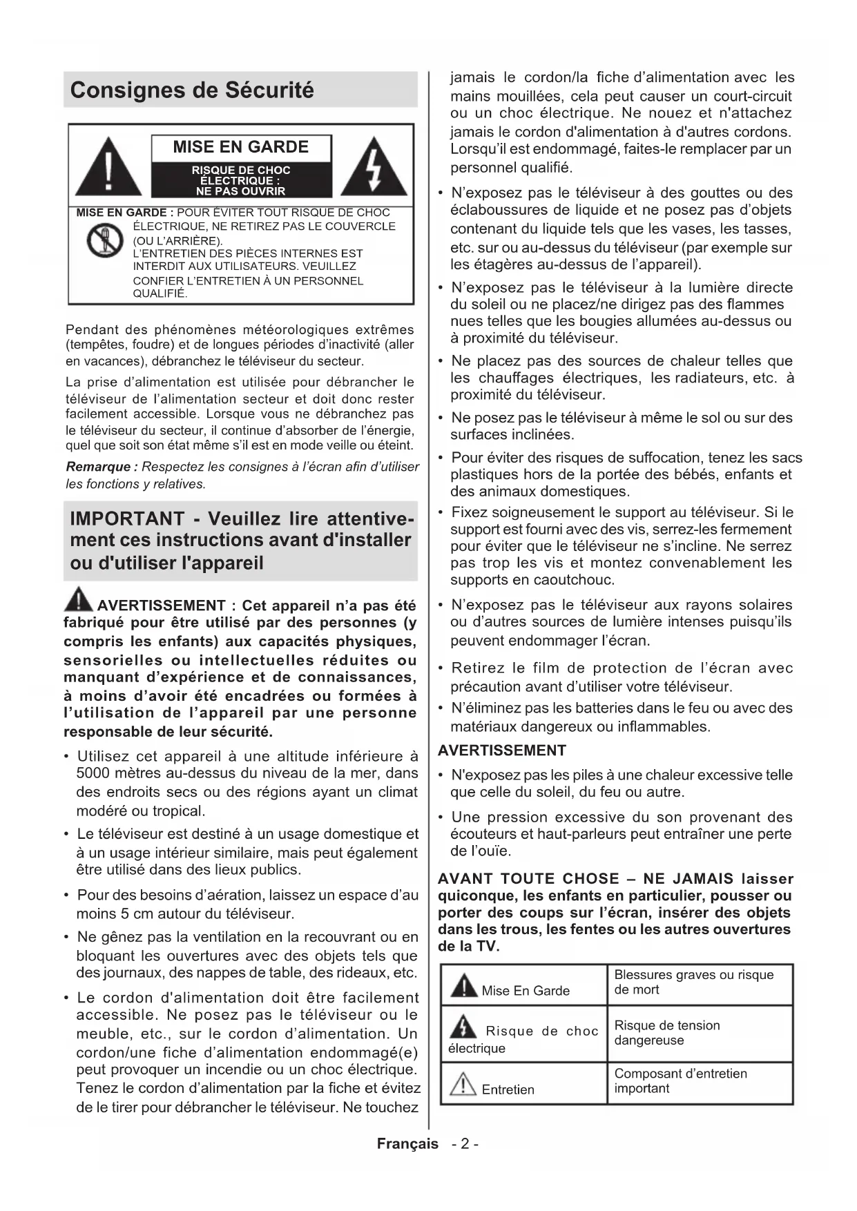 RISQUE DE CHOC ÉLECTRIQUE :NE PAS OUVRIRMISE EN GARDE : POUR ÉVITER TOUT RISQUE DE CHOC ÉLECTRIQUE, NE RETIREZ PAS LE COUVERCLE (OU L’ARRIÈRE). L’ENTRETIEN DES PIÈCES INTERNES EST INTERDIT AUX UTILISATEURS. VEUILLEZ CONFIER L’ENTRETIEN À UN PERSONNEL QUALIFIÉ.Remarque : Respectez les consignes à l’écran an d’utiliser les fonctions y relatives.Pendant des phénomènes météorologiques extrêmes (tempêtes, foudre) et de longues périodes d’inactivité (aller en vacances), débranchez le téléviseur du secteur.La prise d’alimentation est utilisée pour débrancher le téléviseur de l’alimentation secteur et doit donc rester facilement accessible. Lorsque vous ne débranchez pas le téléviseur du secteur, il continue d’absorber de l’énergie, quel que soit son état même s’il est en mode veille ou éteint. IMPORTANT - Veuillez lire attentive- ment ces instructions avant d'installer ou d'utiliser l'appareil