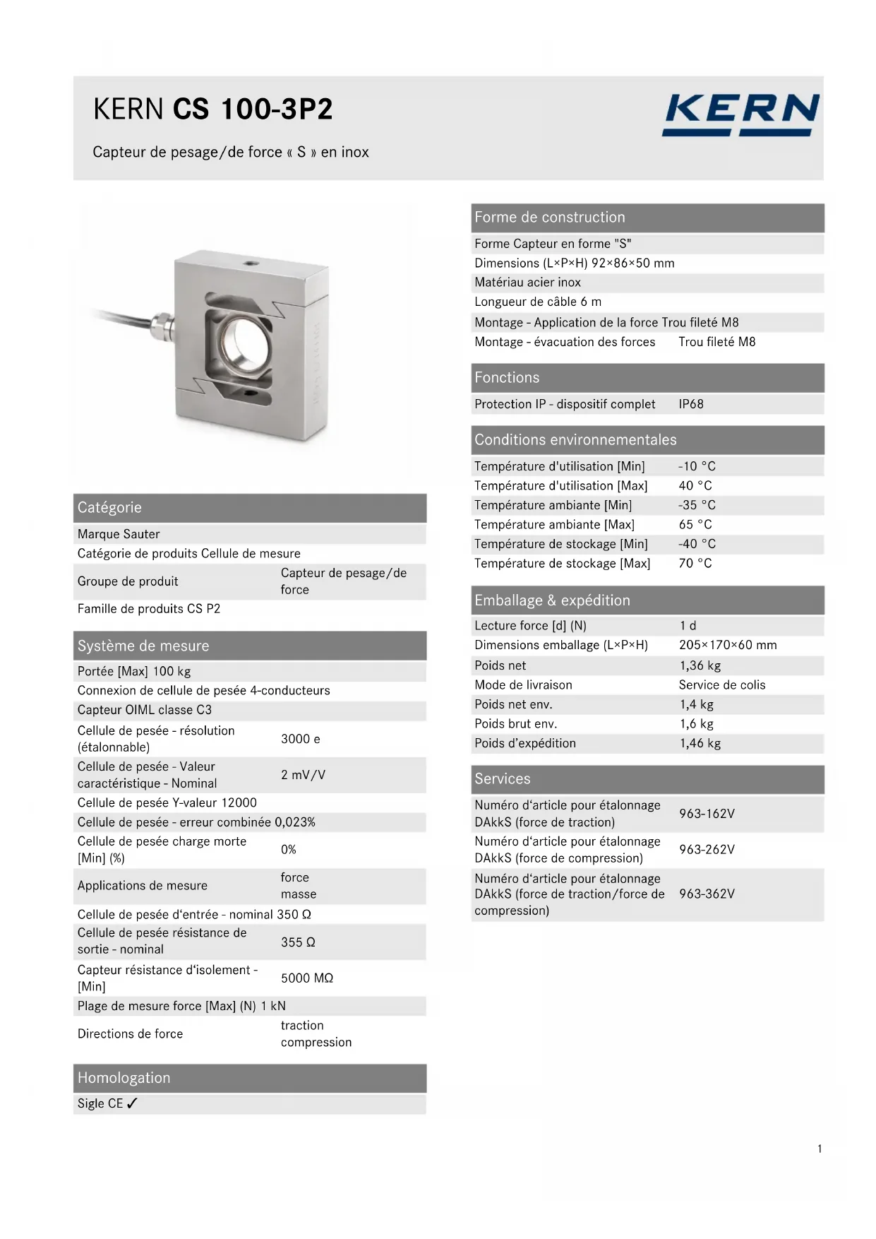 Applications de mesure force masse Cellule de pesée d‘entrée - nominal 350 Ω Cellule de pesée résistance de sortie - nominal 355 Ω Capteur résistance d‘isolement - [Min] 5000 MΩ Plage de mesure force [Max] (N) 1 kN Directions de force traction compression Homologation Sigle CE ✓ Forme de construction Forme Capteur en forme "S" Dimensions (L×P×H) 92×86×50 mm Matériau acier inox Longueur de câble 6 m Montage - Application de la force Trou fileté M8 Montage - évacuation des forces Trou fileté M8 Fonctions Protection IP - dispositif complet IP68 Conditions environnementales Température d'utilisation [Min] -10 °C Température d'utilisation [Max] 40 °C Température ambiante [Min] -35 °C Température ambiante [Max] 65 °C Température de stockage [Min] -40 °C Température de stockage [Max] 70 °C Emballage & expédition Lecture force [d] (N) 1 d Dimensions emballage (L×P×H) 205×170×60 mm Poids net 1,36 kg Mode de livraison Service de colis Poids net env. 1,4 kg Poids brut env. 1,6 kg Poids d’expédition 1,46 kg Services Numéro d‘article pour étalonnage DAkkS (force de traction) 963-162V Numéro d‘article pour étalonnage DAkkS (force de compression) 963-262V Numéro d‘article pour étalonnage DAkkS (force de traction/force de compression)