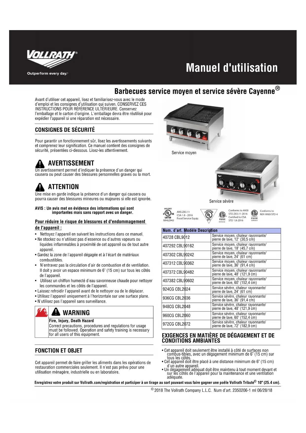 - Cet appareil doit seulement être installé à côté de surfaces non combus-tibles, avec un dégagement minimum de 6" (15 cm) sur tous les côtés. • Cet appareil doit être placé à une distance minimum de 6" (15 cm) d'un autre appareil. • Un dégagement adéquat doit être maintenu à tout moment devant et sur les côtés de l'appareil pour la maintenance et une ventilation adéquate. AVERTISSEMENT ATTENTION WARNING Fire, Injury, Death HazardCorrect precautions, procedures and regulations for usage must be followed. Operation and safety training is necessary for all users of this equipment. Num. d’art. Modèle Description40728 CBL9012 Service moyen, chaleur rayonnante/ pierre de lave, 12" (30,5 cm) 407292 CBL90162 Service moyen, chaleur rayonnante/ pierre de lave, 18" (45,7 cm) 407302 CBL90242 Service moyen, chaleur rayonnante/ pierre de lave, 24" (61 cm) 407312 CBL90362 Service moyen, chaleur rayonnante/ pierre de lave, 36" (91,4 cm) 407372 CBL90482 Service moyen, chaleur rayonnante/ pierre de lave, 48" (121,9 cm) 407382 CBL90602 Service moyen, chaleur rayonnante/ pierre de lave, 60" (152,4 cm) 924CG CBL2024 Service sévère, chaleur rayonnante/ pierre de lave, 24" (61 cm) 936CG CBL2036 Service sévère, chaleur rayonnante/ pierre de lave, 36" (91,4 cm) 948CG CBL2048 Service sévère, chaleur rayonnante/ pierre de lave, 48" (121,9 cm) 960CG CBL2060 Service sévère, chaleur rayonnante/ pierre de lave, 60" (152,4 cm) 972CG CBL2072 Service sévère, chaleur rayonnante/ pierre de lave, 72" (182,9 cm) ANS Z83.11 CSA 1.8 - 2016 Food Service Equip. MH62943 Conforms to ANSI
