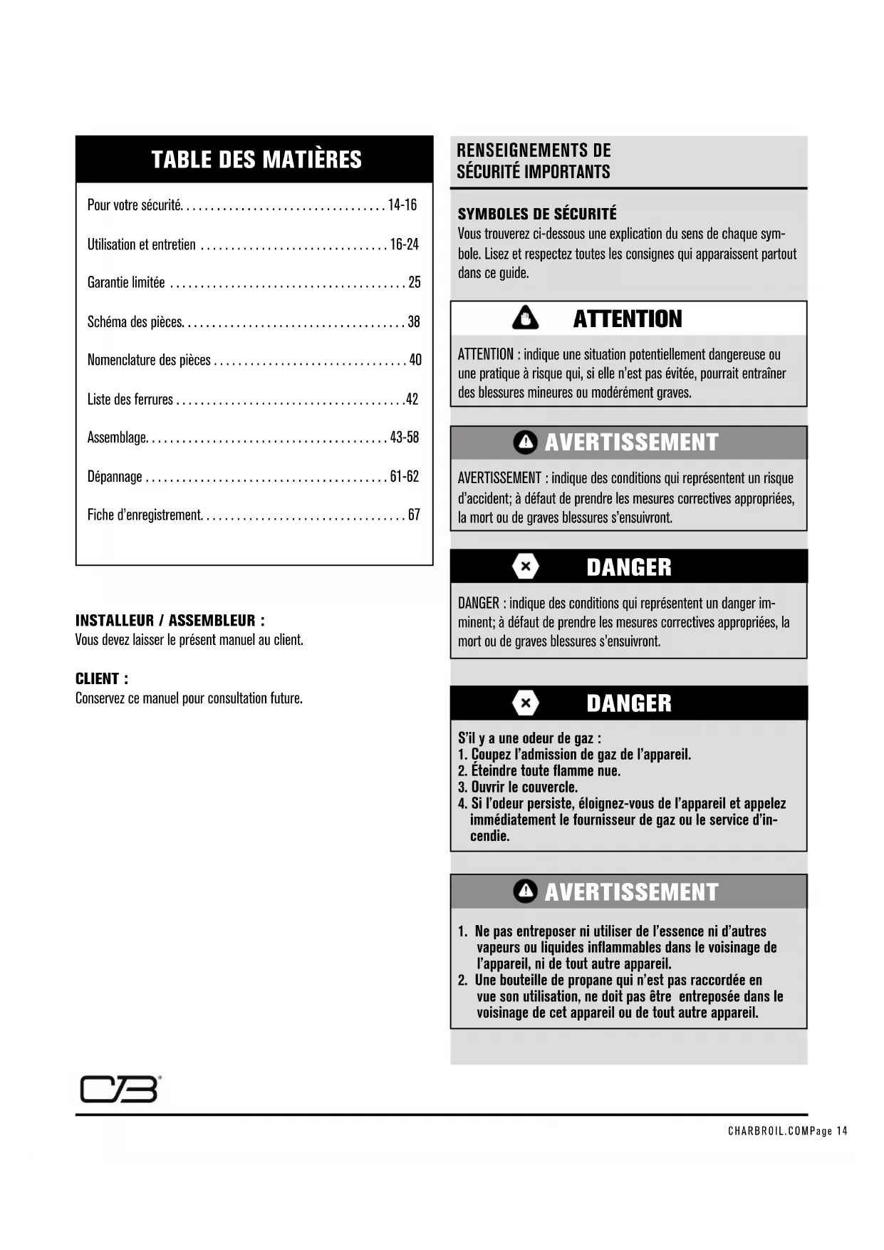 - -62 Fiche d’enregistrement CHARBROIL.COMPage 15 POUR VOTRE SÉCURITÉ – INSTALLATION DE VOTRE GRIL ATTENTION AVERTISSEMENT DANGER Pour utilisation domestique uniquement. Ne pas utiliser à des fins commerciales. Lire et respecter toutes les consignes de sécurité, les instructions d’assemblage et les directives d’emploi et d’entretien avant d’essayer d’assembler cet appareil ou de l’utiliser pour la cuisson. Certaines pièces peuvent être munies de bords coupantsl. Portez des gants de protection au besoin. Incendies de Graisse p. 67