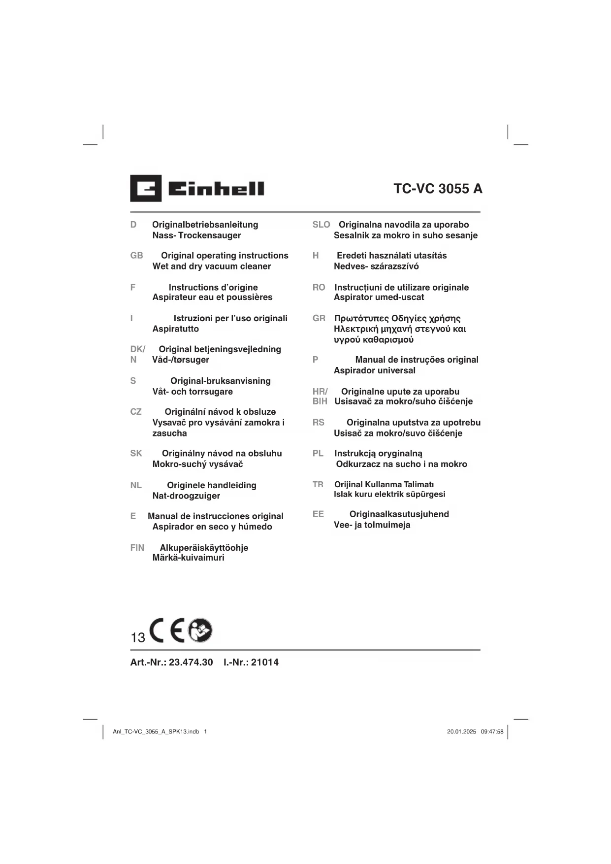 Toute réimpression ou autre reproduction de la documentation et des papiers joints aux produits, même sous forme d’extraits, est uniquement permise une fois l’accord explicite de l’Einhell Germany AG obte- nu. Sous réserve de modifi cations techniques Anl_TC-VC_3055_A_SPK13.indb 23Anl_TC-VC_3055_A_SPK13.indb 23 20.01.2025 09:48:1020.01.2025 09:48:10F