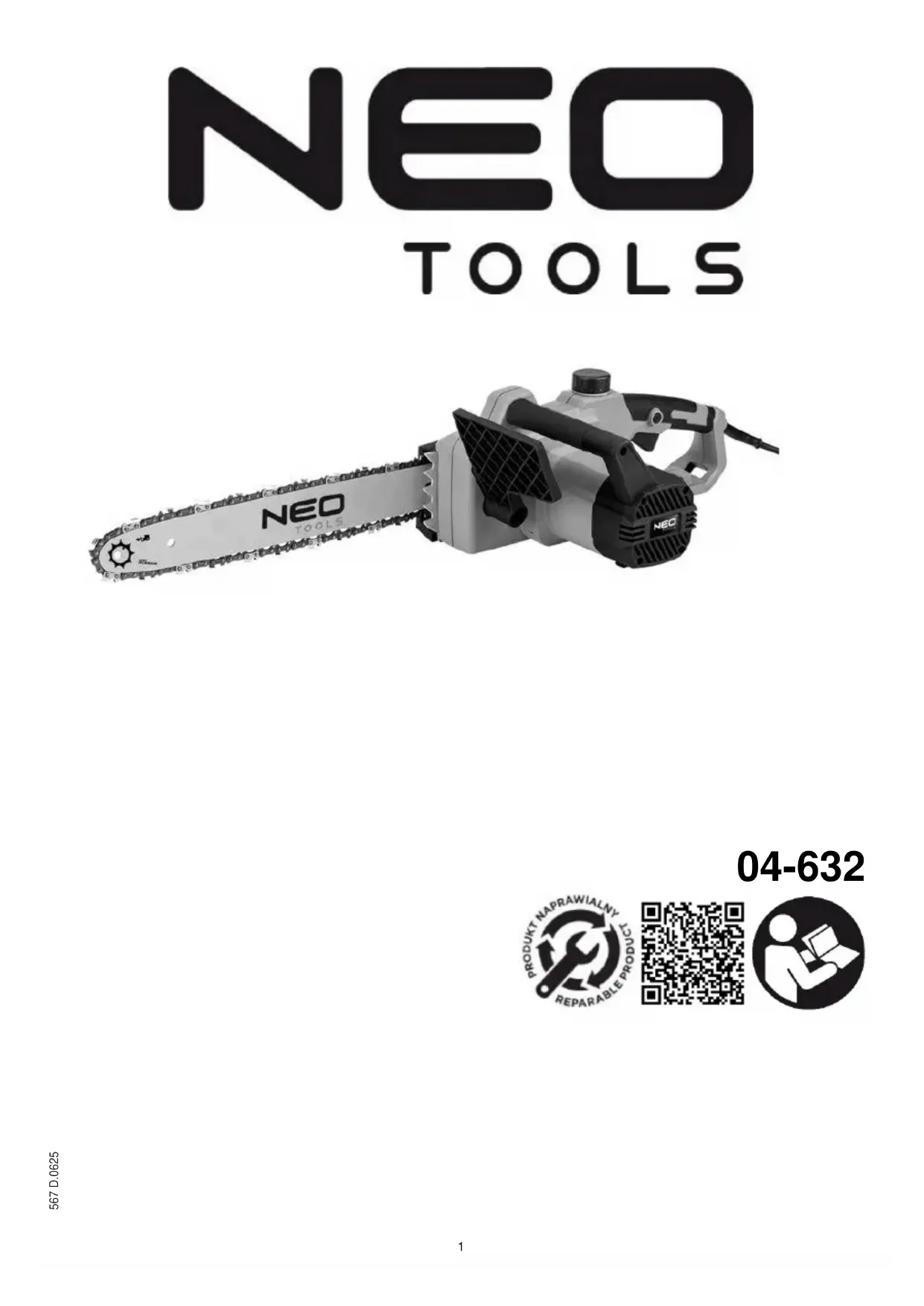 Les produits à alimentation électrique ne doivent pas être jetés avec les ordures ménagères, mais doivent être déposés dans des installations appropriées pour être éliminés. Contactez votre revendeur ou les autorités locales pour obtenir des informations sur la mise au rebut. Les déchets d'équipements électriques et électroniques contiennent des substances qui ne sont pas respectueuses de l'environnement. Les équipements non recyclés présentent un risque potentiel pour l'environnement et la santé humaine. "GTX Poland Spółka z ograniczoną odpowiedzialnością" Spółka komandytowa, dont le siège social est situé à Varsovie, ul. Pograniczna 2/4 (ci-après : " GTX Poland ") informe que tous les droits d'auteur sur le contenu de ce manuel (ci-après : " Manuel "), y compris entre autres. Tous les droits d'auteur relatifs au contenu de ce manuel (ci-après dénommé "Manuel"), y compris, mais sans s'y limiter, son texte, ses photographies, ses diagrammes, ses dessins, ainsi que sa composition, appartiennent exclusivement à GTX Poland et font l'objet d'une protection juridique en vertu de la loi du 4 février 1994 sur les droits d'auteur et les droits connexes (c'est-à-dire le Journal des lois 2006 n° 90, article 631, tel qu'amendé). La copie, le traitement, la publication, la modification à des fins commerciales de l'ensemble du manuel ainsi que de ses éléments individuels sans le consentement écrit de GTX Poland sont strictement interdits et peuvent entraîner des responsabilités civiles et pénales. Déclaration de conformité CE Fabricant : GTX Poland Sp. z o.o. Sp.k, 2/4 rue Pograniczna 02-285 Varsovie Produit : Tronçonneuse Modèle : 04-632 Nom commercial : NEO TOOLS Numéro de série : 00001 ÷ 99999 Le produit décrit ci-dessus est conforme aux documents suivants : Directive Machines 2006/42/CE Directive sur la compatibilité électromagnétique 2014/30/EU Directive RoHS 2011/65/EU modifiée par la directive 2015/863/EU Niveau de puissance acoustique garanti LWA= 108 dB(A) Niveau de puissance acoustique mesuré LwA= 103dB(A) K=3dB(A) Et répond aux exigences des normes : EN 62841-1:2015 + A11:2022 ; EN 62841-4-1:2020 EN IEC 55014-1 : 2021 ; EN IEC 61000-3-2 : 2019+A1:2021 ; EN IEC