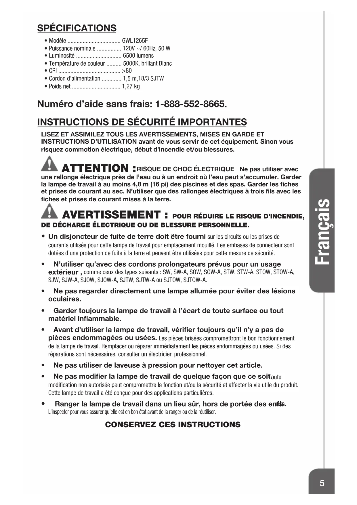 - Ranger la lampe de travail dans un lieu sûr, hors de portée des enfa nts.L’inspecterpourvousassurerqu’elleestenbonétatavantdelarangeroudelaréutiliser. CONSERVEZ CES INSTRUCTIONSFrançais Lampe de travail del pliable de 6500 Lumens Manuel d’utilisation GWL1265F