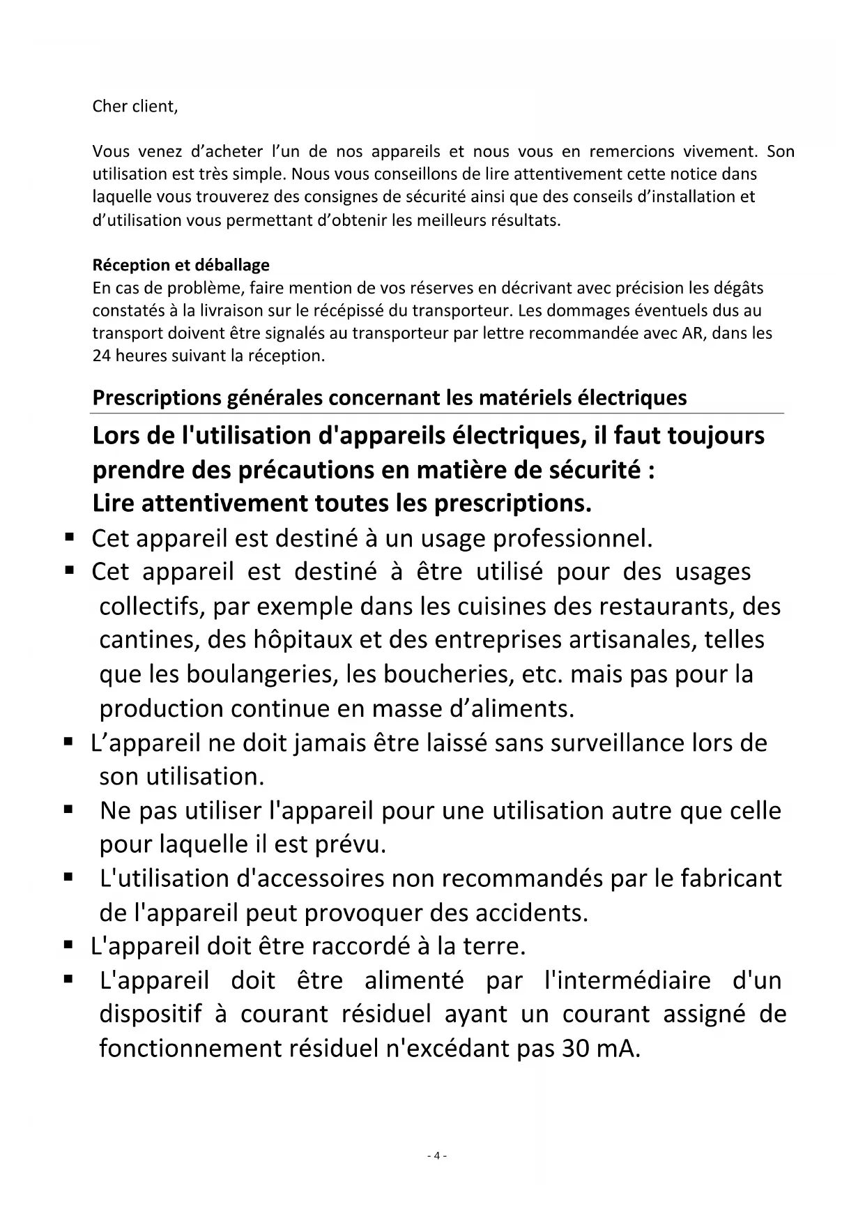 - Cet appareil est destiné à être utilisé pour des usages collectifs, par exemple dans les cuisines des restaurants, des cantines, des hôpitaux et des entreprises artisanales, telles que les boulangeries, les boucheries, etc. mais pas pour la production continue en masse d’aliments.