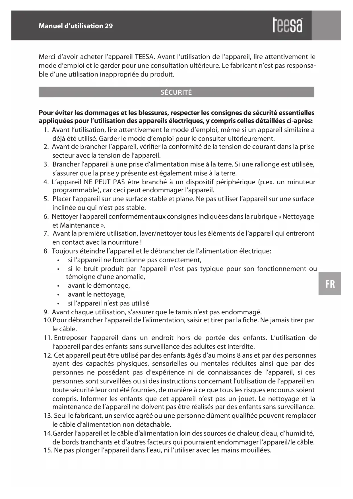 Merci d'avoir acheté l'appareil TEESA. Avant l'utilisation de l'appareil, lire attentivement le mode d'emploi et le garder pour une consultation ultérieure. Le fabricant n'est pas responsable d'une utilisation inappropriée du produit.