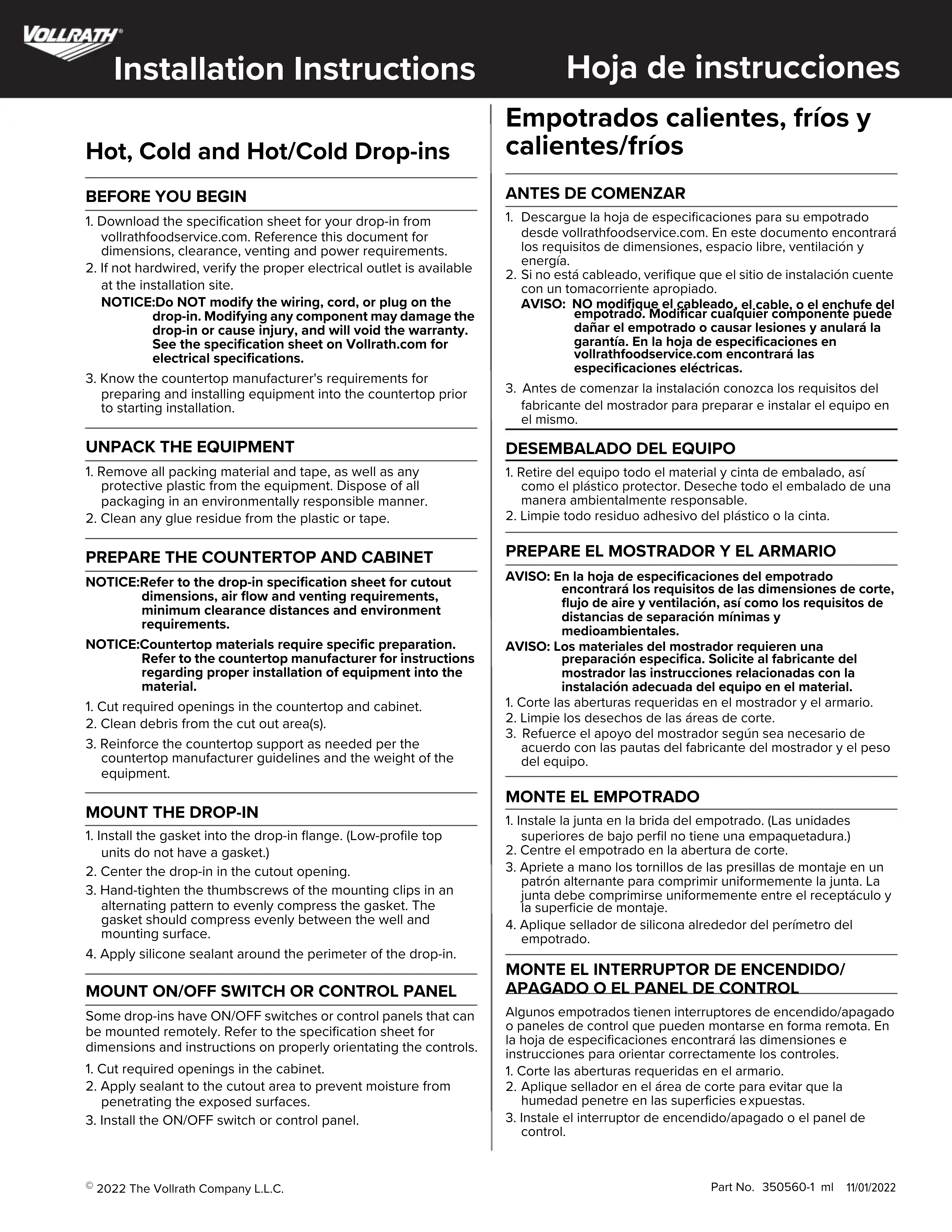 disponible au site d'installation. AVIS : NE modifiez pas le câblage, le câble, ou la fiche électrique du bac encastrable. La modification d'un quelconque composant risque d'endommager le bac encastrable ou de causer des blessures, et elle annulera la garantie. Pour les caractéristiques électriques, voir la fiche des caractéristiques techniques sur Vollrath.com.