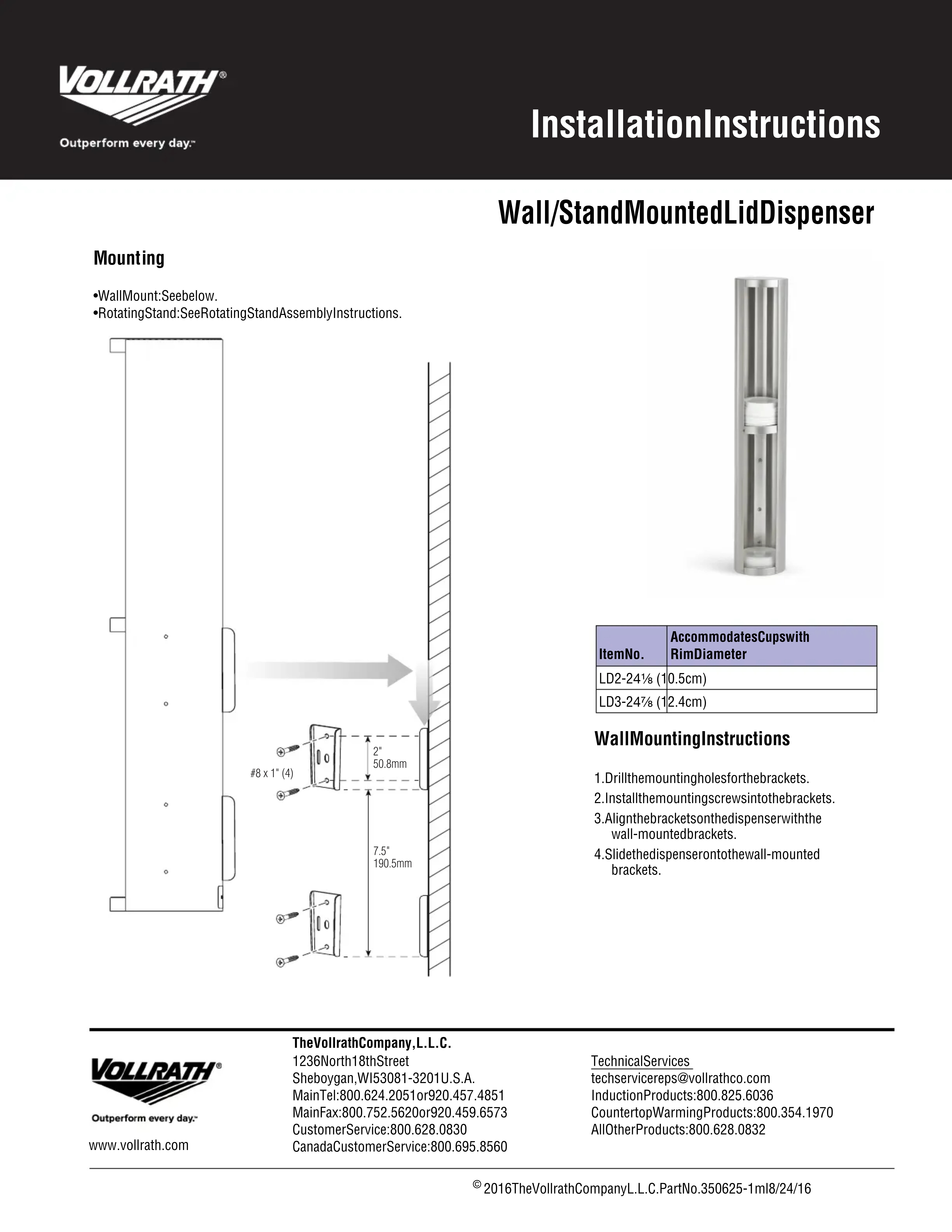 LD32 - Distributeur de couvercles Vollrath - Notice d'utilisation et mode d'emploi gratuit