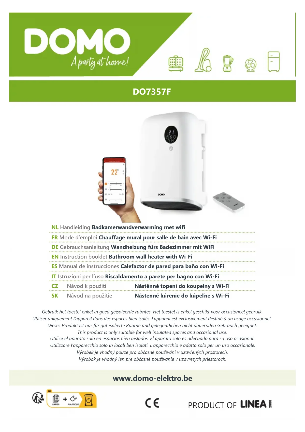 Ce produit est conforme aux exigences de l’UE en matière d’interférences radio. Par la présente, Linea 2000 BV déclare que ce chauage dont le code produit est DO7357F est conforme aux dispositions de la directive de l’UE 2014/53/UE. Le texte complet de la déclaration de conformité pour l’UE est disponible sur la page du produit DO7357F sur le site web de DOMO : https://www. domo-elektro.be34 www.domo-elektro.be